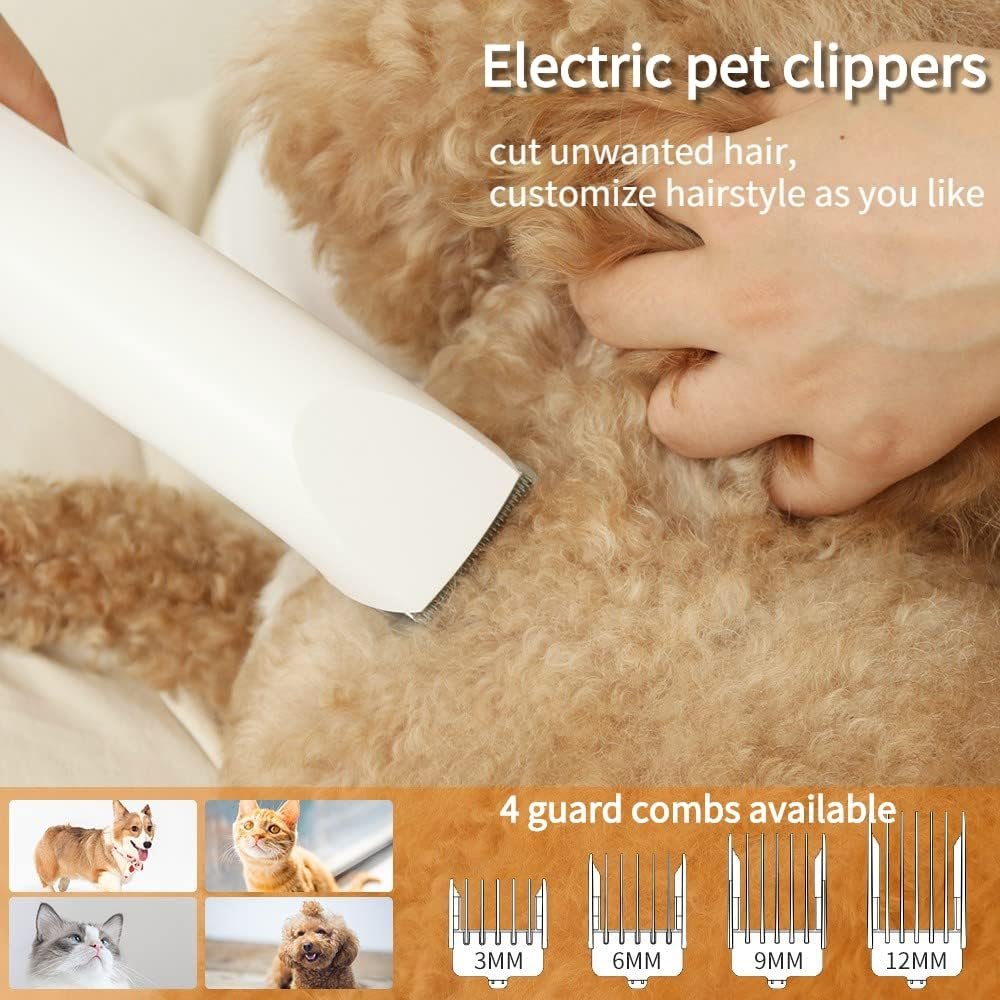 【Professional pet grooming vacuum】Our vacuum kit meets all your need for pet grooming: The electric clipper is used for seasonal trimming, deshedding brush for removing undercoat fur, slicker brush for daily combing & reducing tangling, and crevice tool for collecting pet hair left on sofas & carpets.