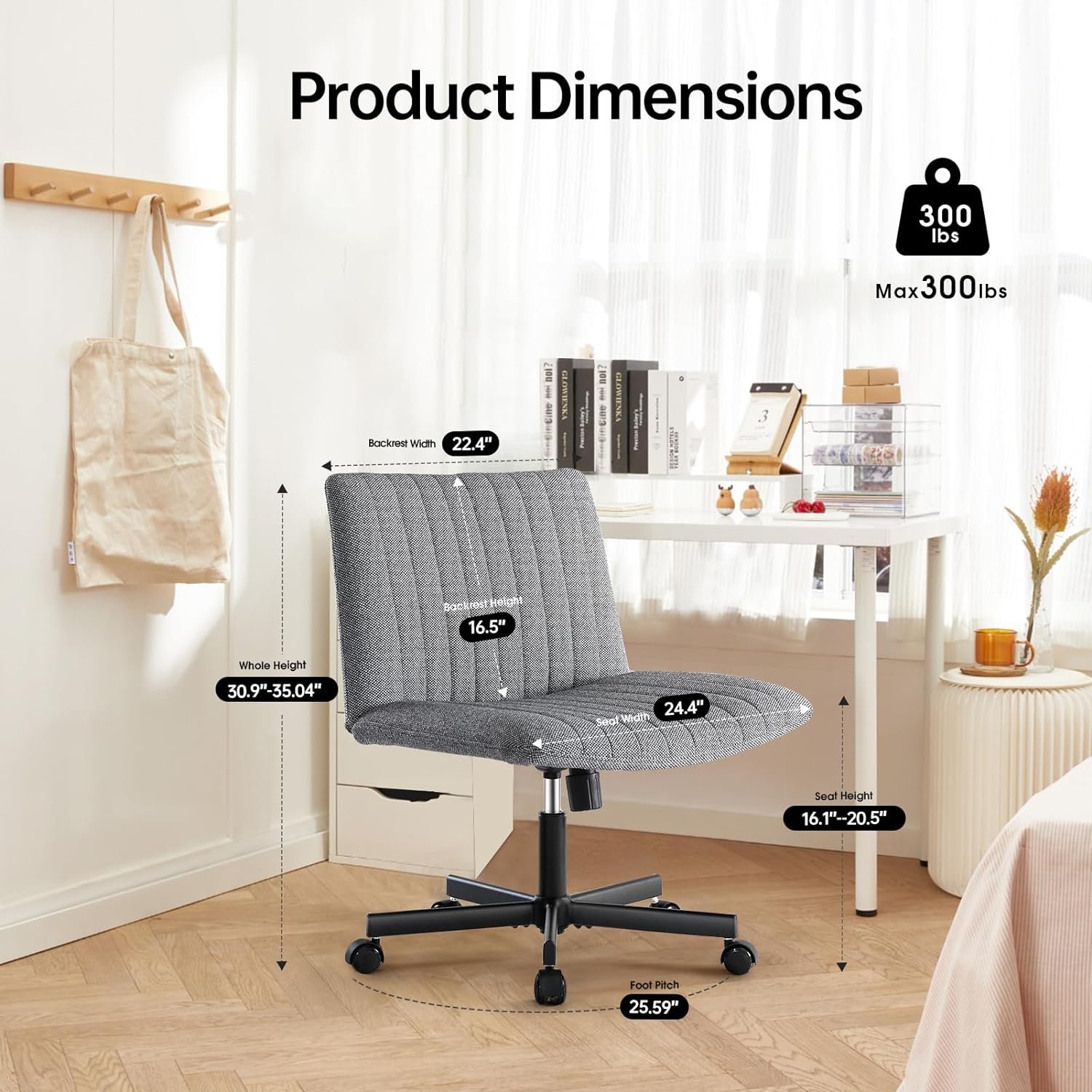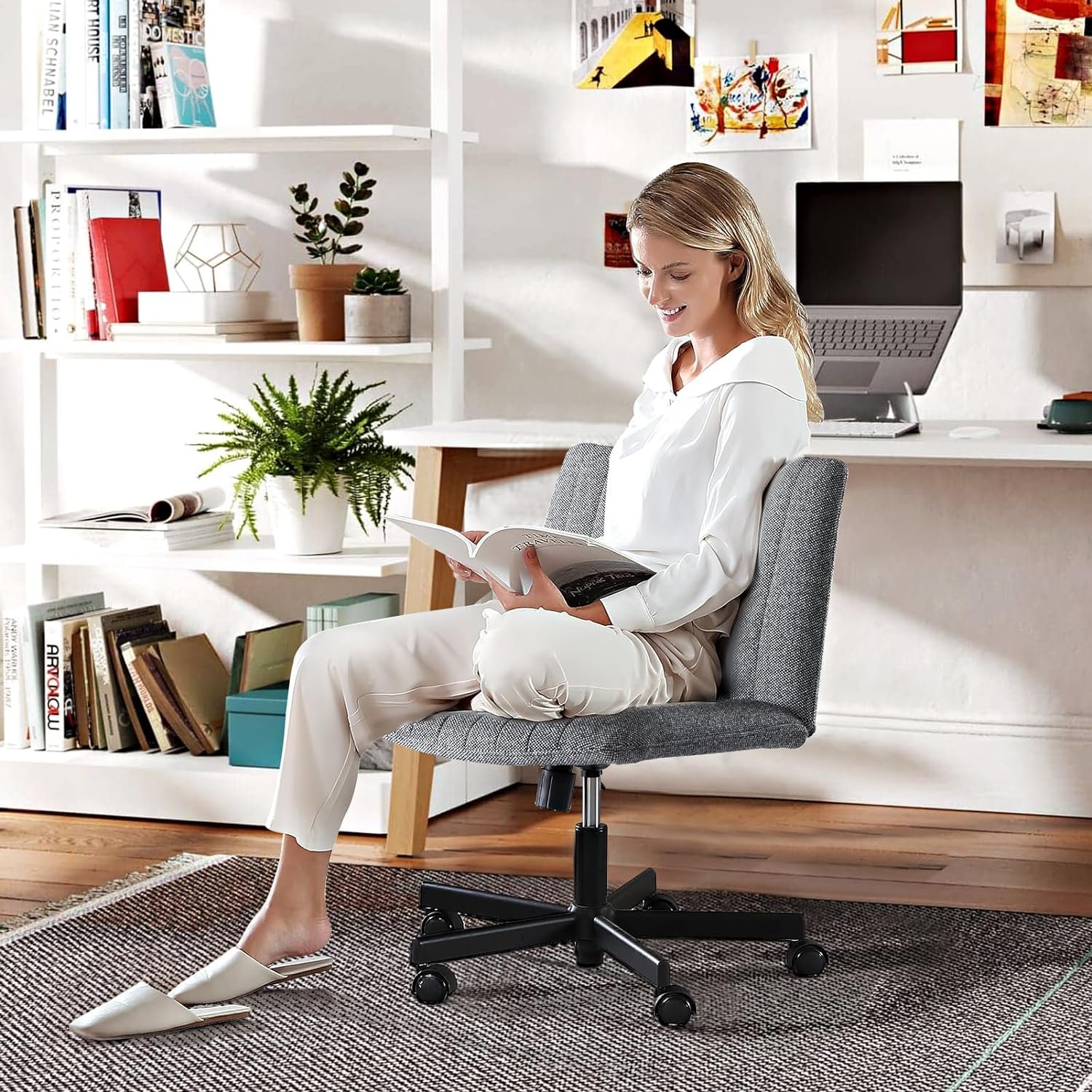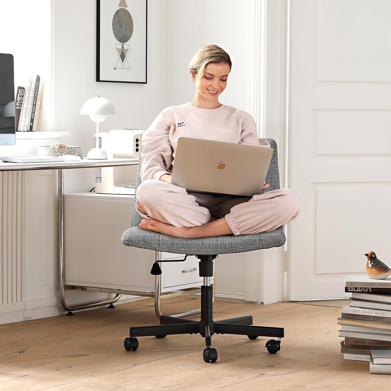 LEAGOO Cross Legged Office Chair, Armless Wide Desk Chair with Wheels, 120° Rocking Mid Back Ergonomic Computer Task Vanity Chairs with Height adiust, for Home, Office, Make up, Small Space, Dark gray