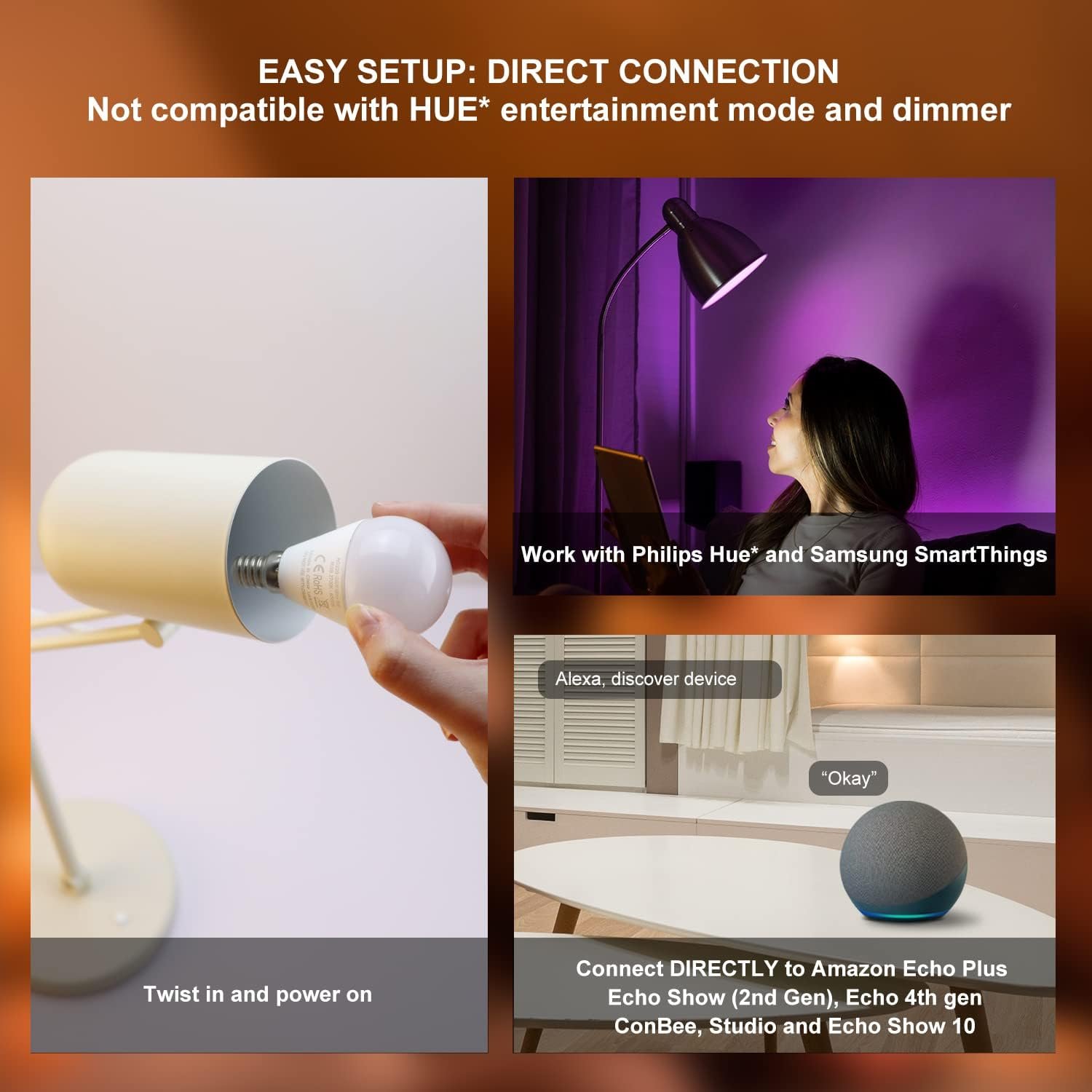 【Important Note】LEDEPLY Zigbee A15 E12 smart bulbs can be connected DIRECTLY to Amazon Echo Plus, Echo Show (2nd Gen), Echo 4th gen, Studio and Echo Show 10. All other Alexa devices, like the Echo Dot, and Google home, require a Hub. Compatible with ConBee. Not compatible with Apple Homekit or the Hu*e* Entertainment mode.