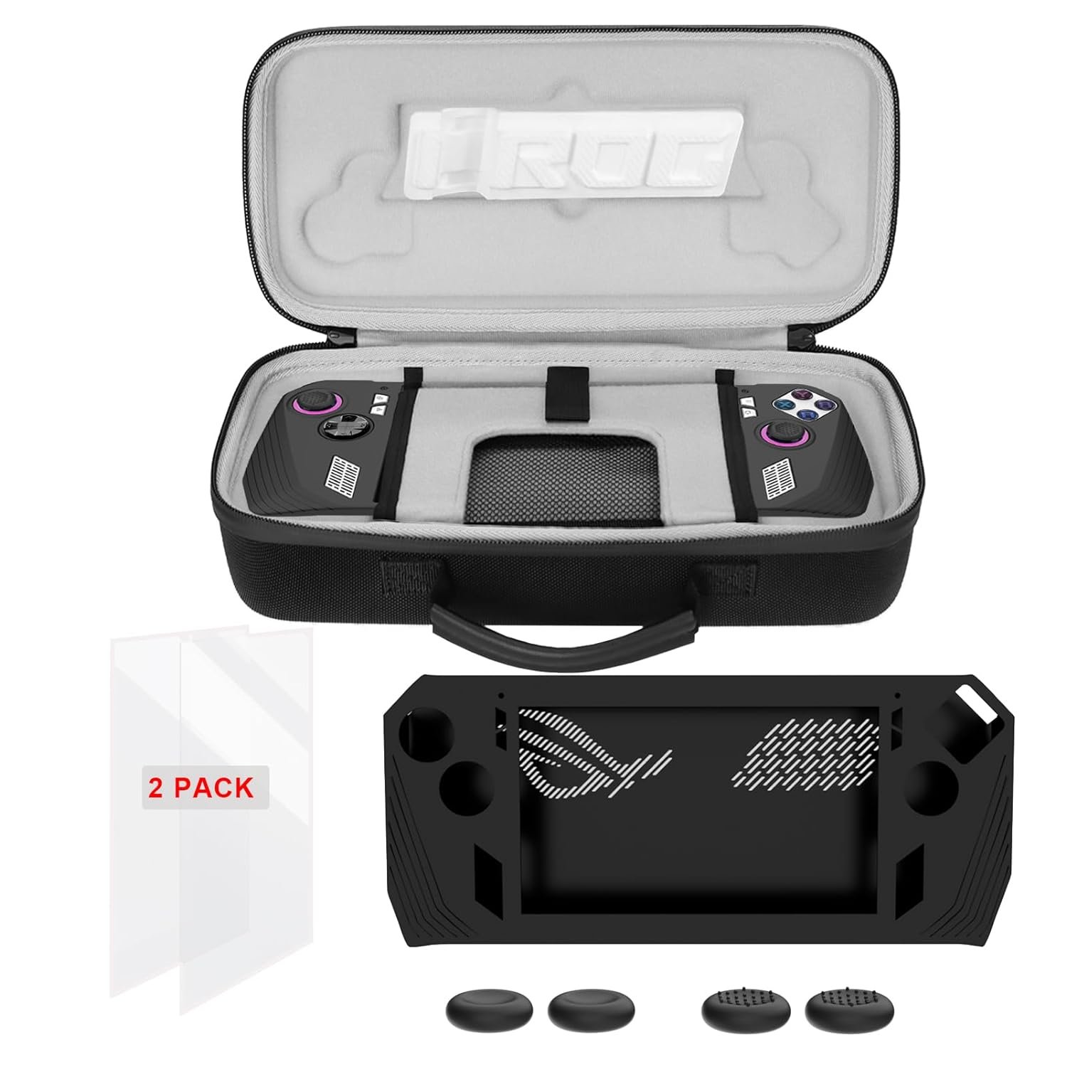 —–Products include: 1*rog ally carrying bag 1 * Silicone game console protective cover 4 * Button silicone sleeve and 2*Screen Cleaning kit