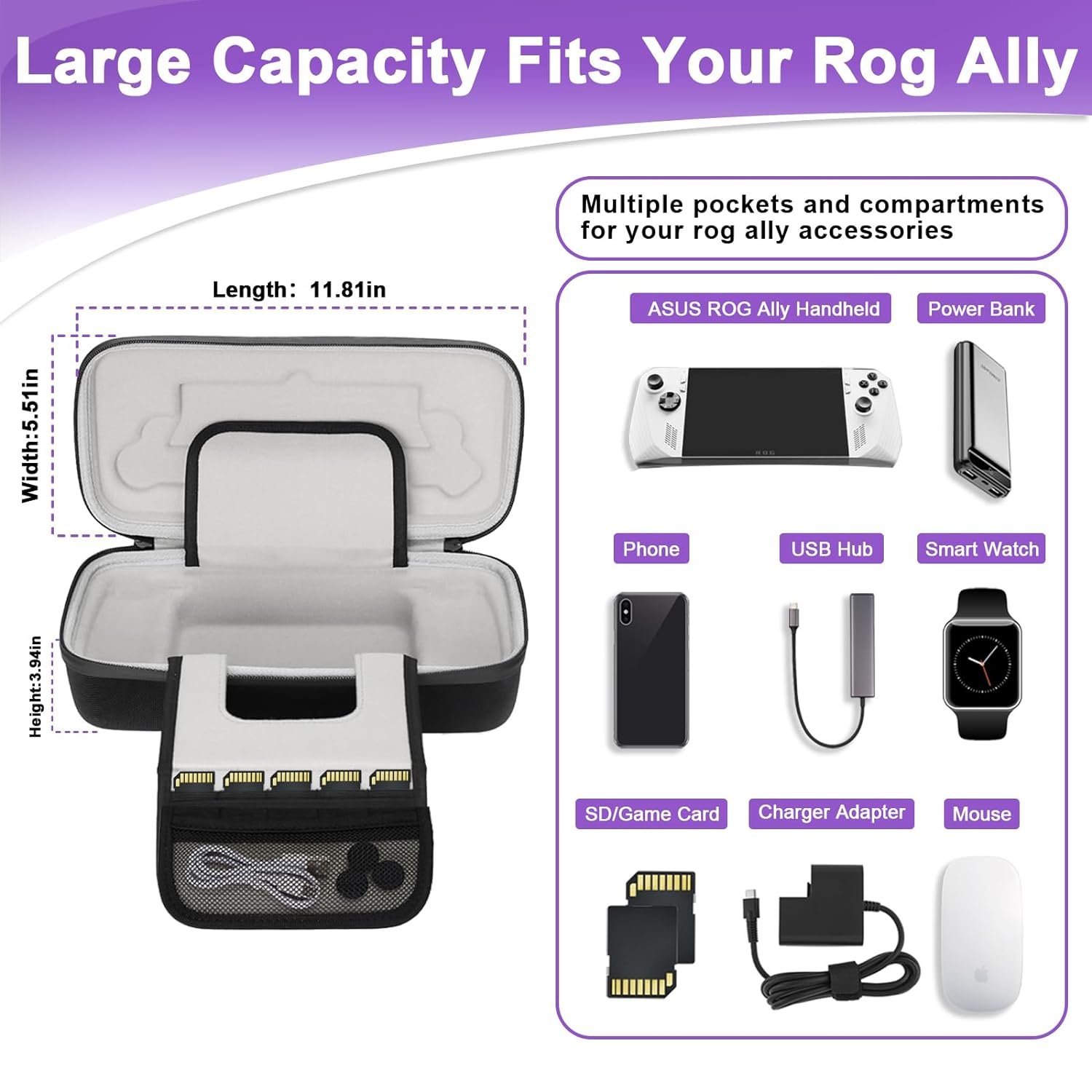🎮Large Capacity🎮 The asus rog alloy handheld case includes 5 game card slots. Mesh pockets can hold cables and other small accessories. The large capacity space design can store your rog ally and other necessary game accessories well, such as original chargers, power banks, headphones, charging cables, handles, etc. It will be the perfect companion for protection of your grog ally!