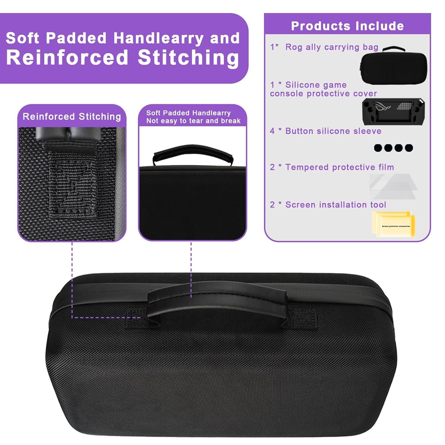 🎮Comfortable Handle🎮 You can carry the bag anywhere. The soft handle design increases carrying comfort, thickened sponge cushion PU handle reducing the pressure of carrying for a long time, rog ally carrying bag is easy for traveling or storing. The product includes Asus Rog Ally handheld case and 2*Screen Cleaning kit and 1 silicone game console protective case (including 4 button silicone cases).