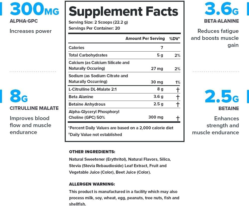 100% PRE WORKOUT POWDER. Pulse is a sweetened and flavored pre workout supplement that contains large and effective doses of the best science-backed ingredients, including those found in many nitric oxide supplements: L citrulline malate, betaine, beta alanine and alpha gpc.