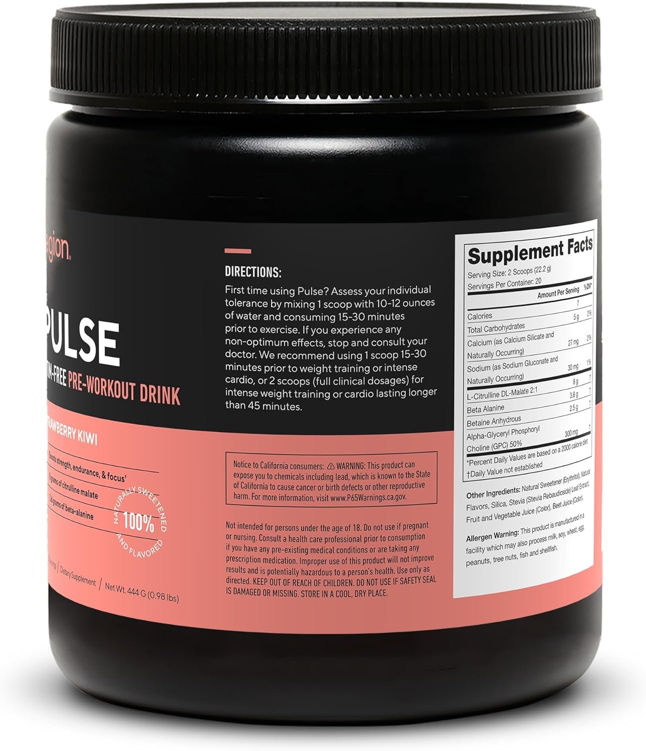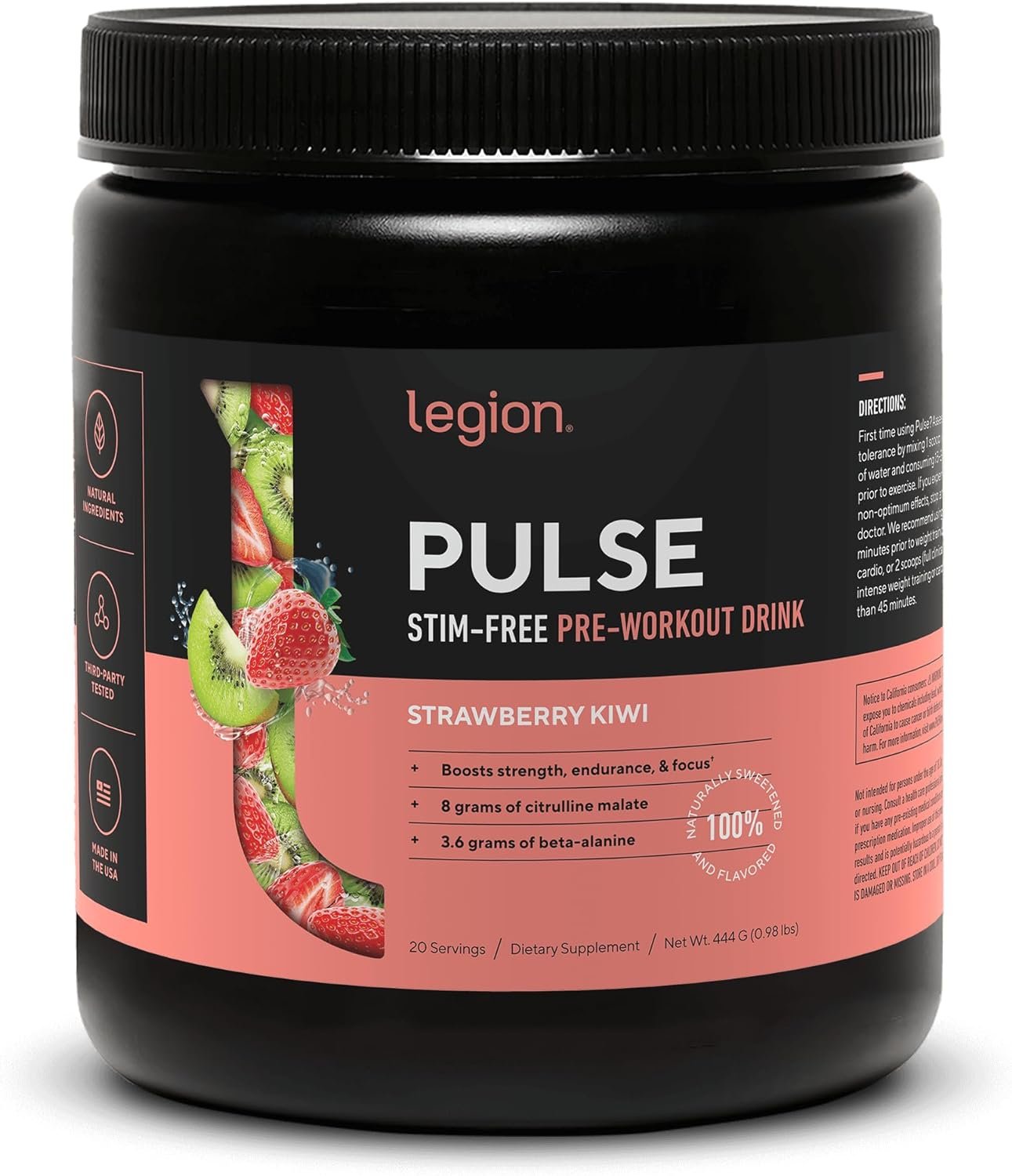 LEGION Pulse Pre Workout Supplement – All Natural Nitric Oxide Preworkout Drink, Creatine Free, Naturally Sweetened, Beta Alanine, Citrulline, Alpha GPC (Caffeine Free Strawberry Kiwi)