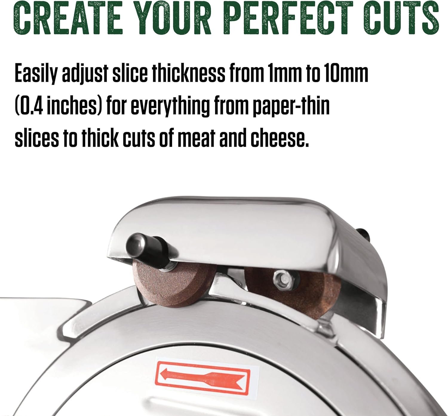 Product 1: Customize Your Cuts: From ultra-thin slices of prosciutto to thicker cuts of ham or roast beef, our slicer easily lets you adjust the thickness of your cuts. Simply turn the graduated knob to make slices from 1mm to 10mm (0.4 inches) thick.