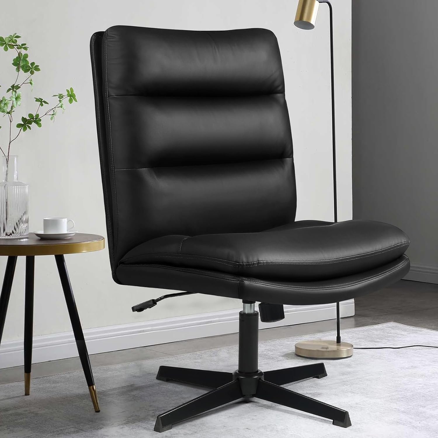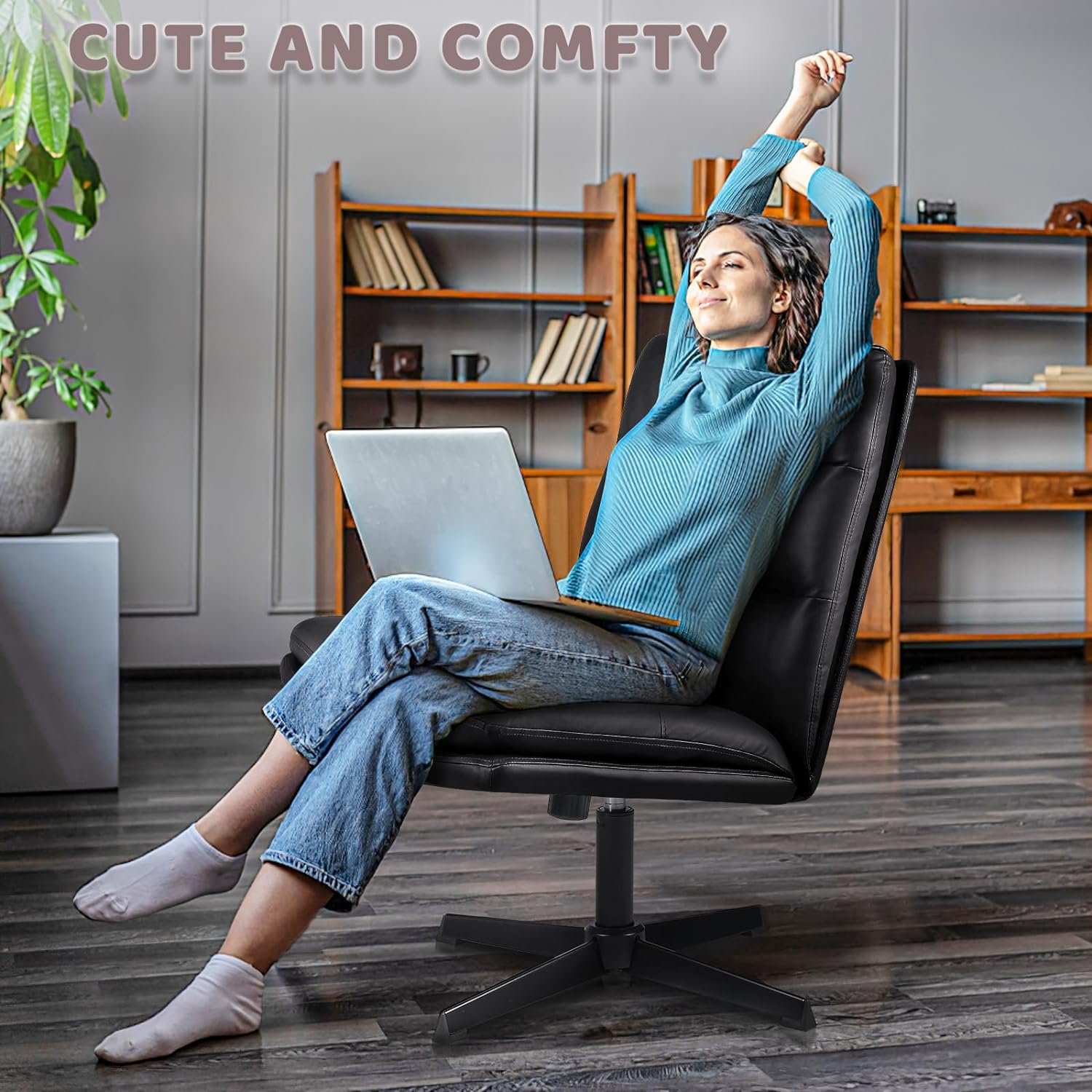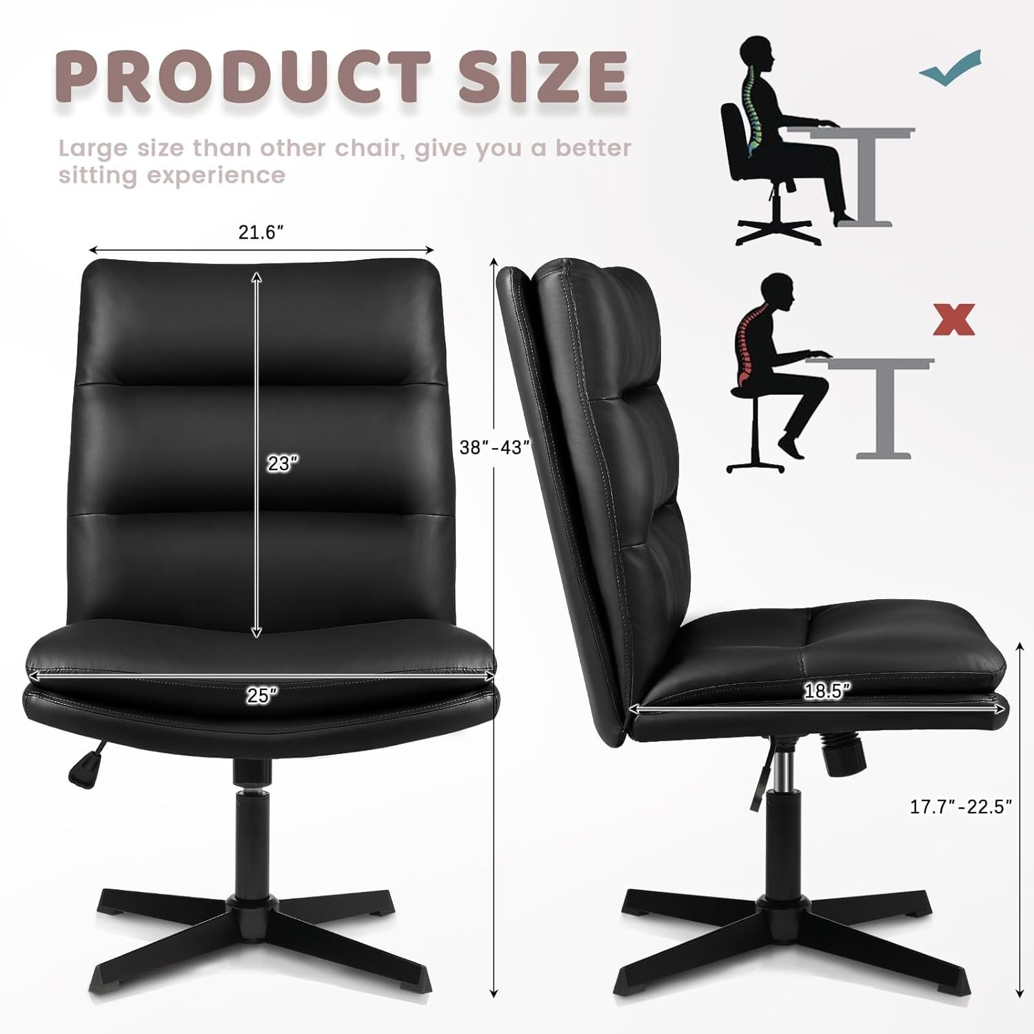 LEMBERI PU-Padded Armless Office Desk Chairs No Wheels, High-Back Wide Seat Home Office Desk Chair, 120°Rocking Cross Legged Computer Task Chairs, Modern Adjustable Swivel Vanity Chair (Black)