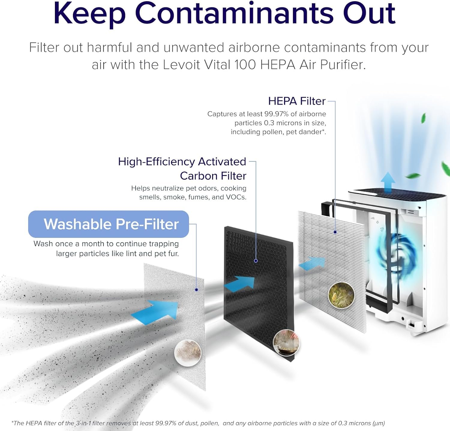 3-STAGE FILTRATION: Comes equipped with a washable pre-filter for large particles like lint and fur, a High-Efficiency Activated Carbon Filter for toxic fumes and unpleasant odors, and an HEPA Filter, which captures at least 99.97% of dust, pollen, and any airborne particles with a size of 0.3 microns (ยตm)