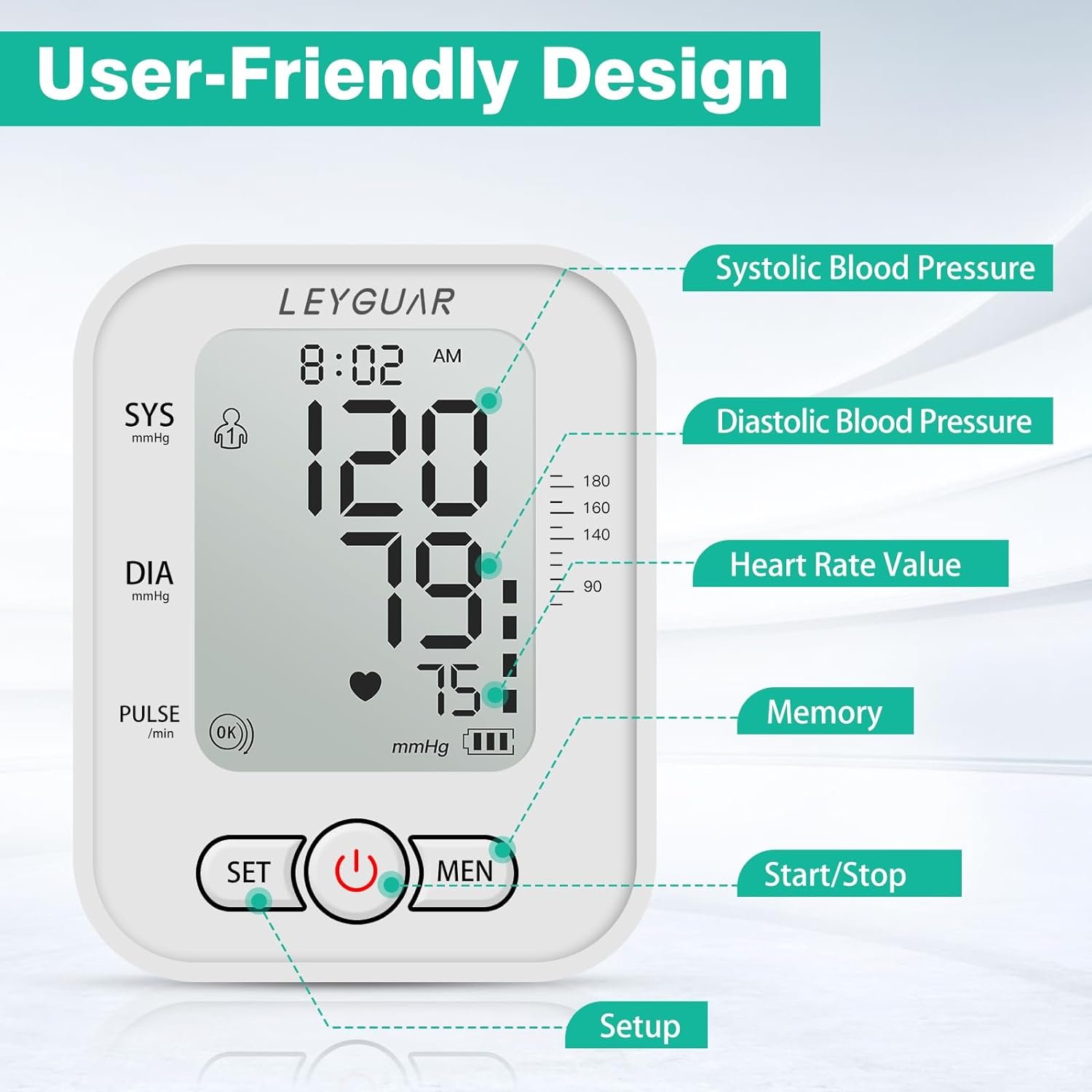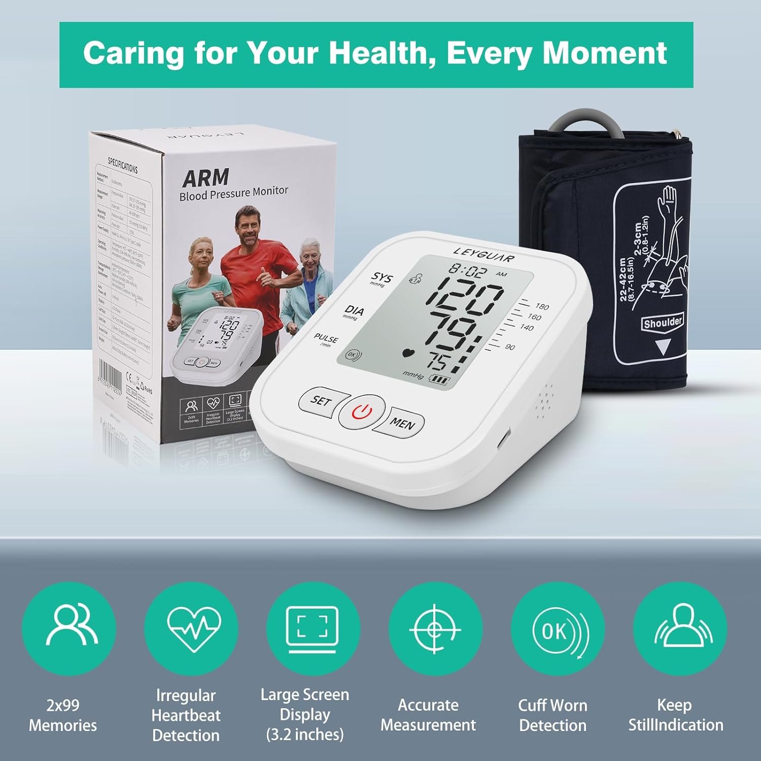 【Advanced Memory Storage】 The LEYGUAR Blood Pressure Monitor for home use also offers exceptional memory storage, capable of storing up to 2×99 readings. This feature facilitates easy tracking and comparison of blood pressure readings over time, making it perfect for families or individuals closely monitoring their health.