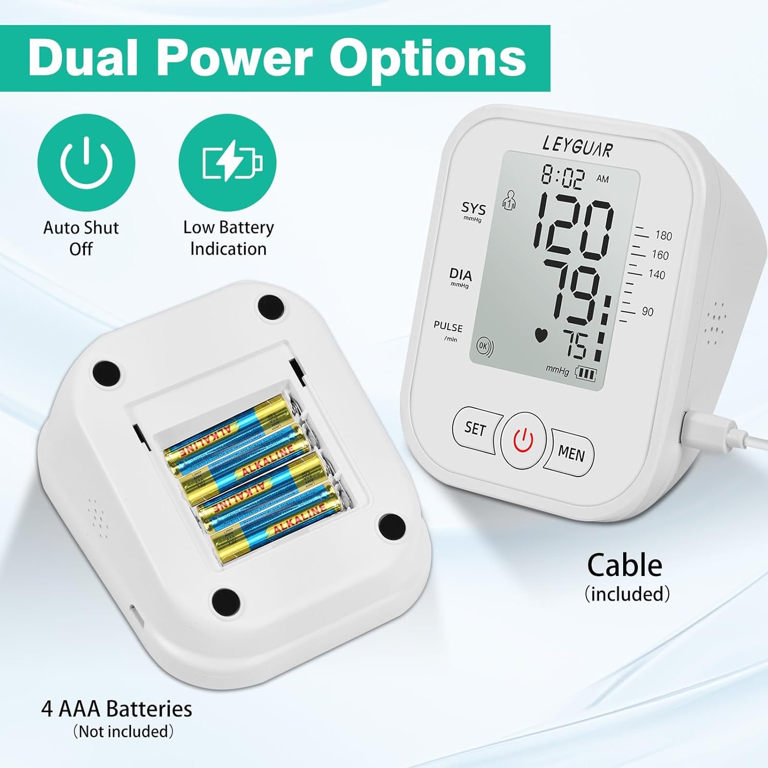 【Dual Power Options】Designed for ultimate convenience, the LEYGUAR Blood Pressure Monitor offers dual power options. Whether at home or on the go, it can be powered via a USB-C connection or with AAA batteries (not included), ensuring flexibility and reliability in every measurement.