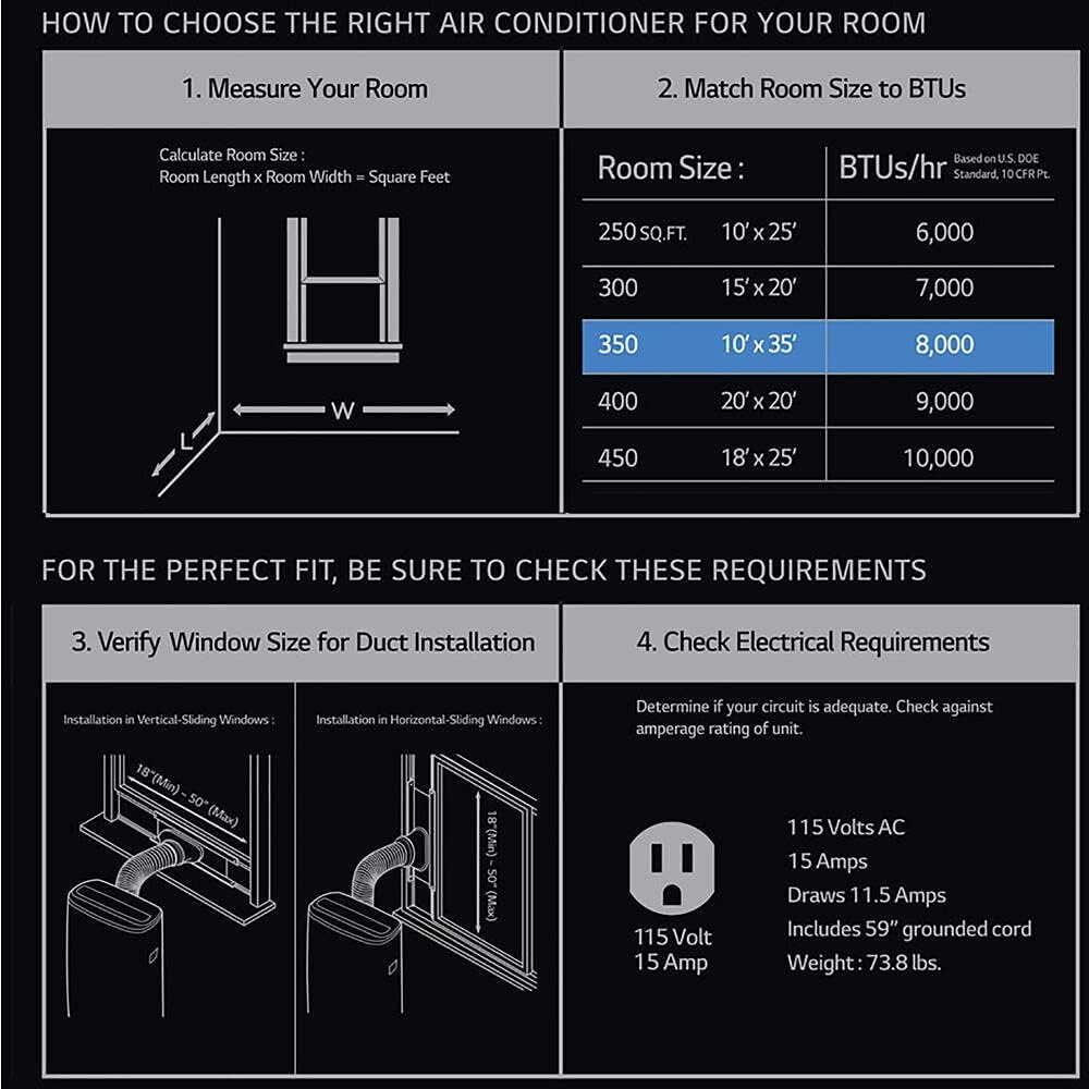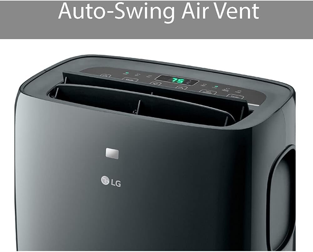 Upgrade your cooling experience with this LG smart portable air conditioner. Using LG ThinQ technology, control your air conditioner from anywhere with your phone or use Amazon Alexa and Hey Google to adjust settings using your voice. Enjoy the convenience of personalized control and versatile cooling capabilities. Designed for medium-sized rooms up to 350 sq. ft., this quiet unit provides excellent cooling performance. Adjust the cooling and fan speeds to your preference and program a cooling schedule with the 24-hour timer. The auto-swing air vent ensures balanced airflow throughout the room, making it ideal for cooling, dehumidifying, or circulating air. Don’t worry about power outages. The auto restart feature will automatically turn the unit back on once power is restored, ensuring uninterrupted comfort. Effortlessly move the air conditioner with the easy rolling casters, allowing you to enjoy cool air in any area of your home or office. Control your air conditioner from a distance with the included LCD remote control. The easy window venting installation kit simplifies setup, and the removable and washable filter ensures clean and healthy air output. The check filter alert reminds you when it’s time to clean the filter for optimal performance.