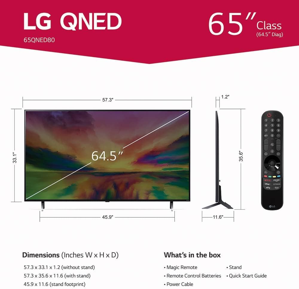 LG QNED80 combines cutting-edge Quantum Dots with LG’s NanoCell technology to create uniquely bright, colorful images. The AI powered LG QNED80 has a super-fast native 120Hz refresh rate, so you see smoother action; plus, Dimming Pro dynamically adjusts the back lights to maintain deep black levels, allowing you to be fully immersed in your content. You’ll enjoy outstanding picture powered by the a7 AI Processor Gen6, which uses AI to detect what you’re watching and automatically improves the picture and sound quality. You’ll also experience less searching and more streaming, thanks to the next generation of AI technology from LG webOS 23. With Quick Cards, group your favorite apps into categories and use the Magic Remote to easily find what you’re looking for—like instant access to over 300 free channels with LG Channels.* Every moment will be enhanced with virtual 5.1 surround sound for an immersive home theater experience. And transport yourself to the center of superhero-sized action and galaxies far, far away with LG’s FILMMAKER MODE that allows you to see films just as the directors intended. For gamers, you’ll experience real-time action with virtually no tearing from FreeSync, VRR and GeForce NOW for cloud gaming.** Plus, the LG Game Optimizer, Game Dashboard and two HDMI 2.1 ports get you (and keep you) in the action. *Internet connection and subscriptions to streaming services are required; number of LG Channels subject to change. **Subscription and compatible gaming controller are required.