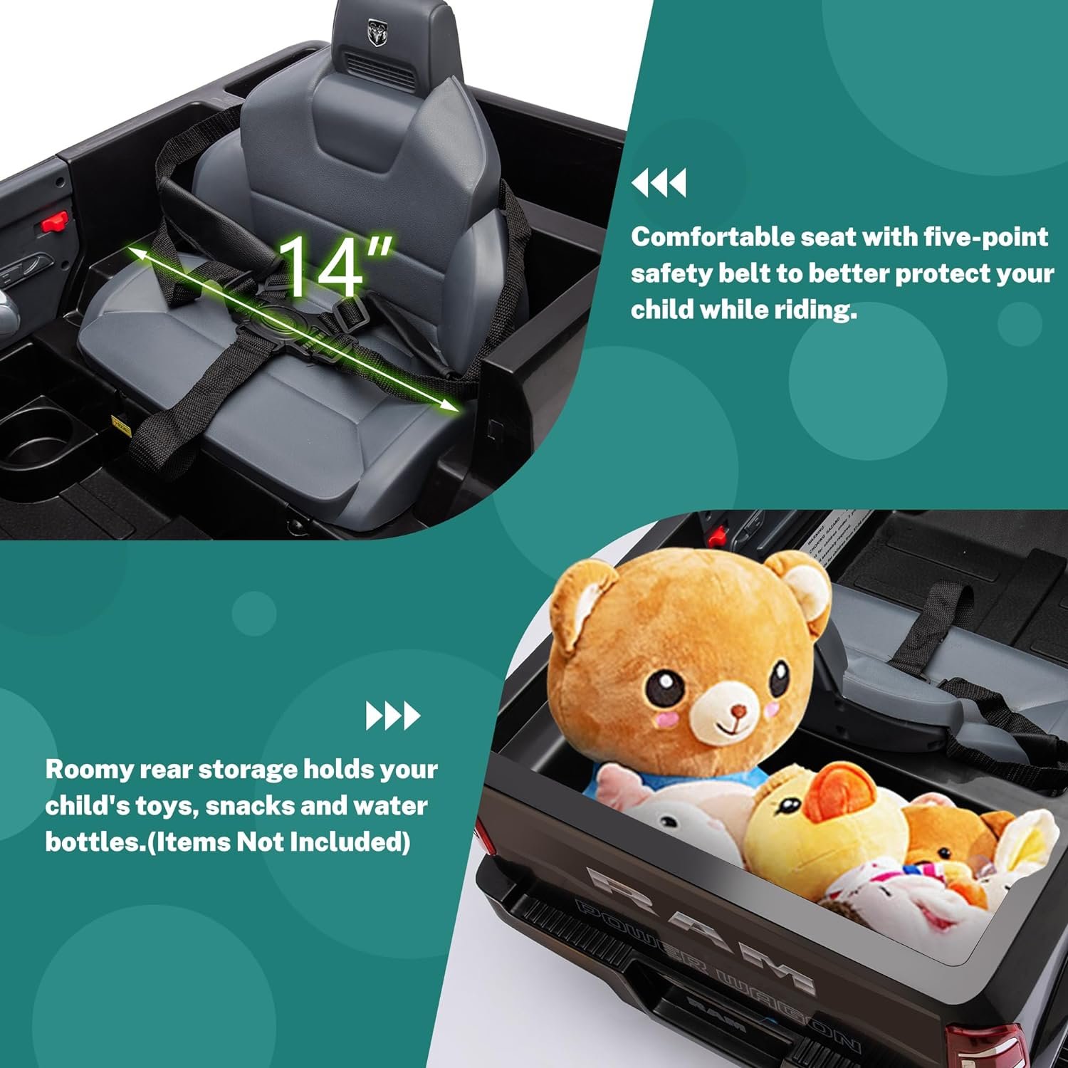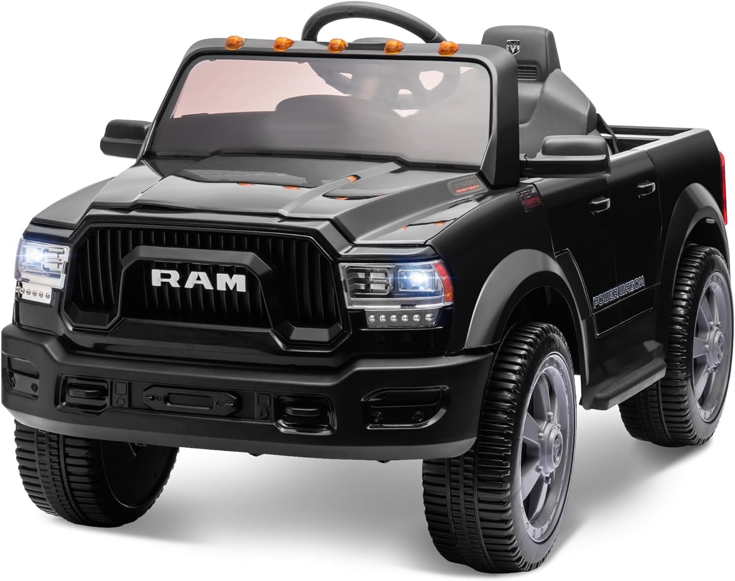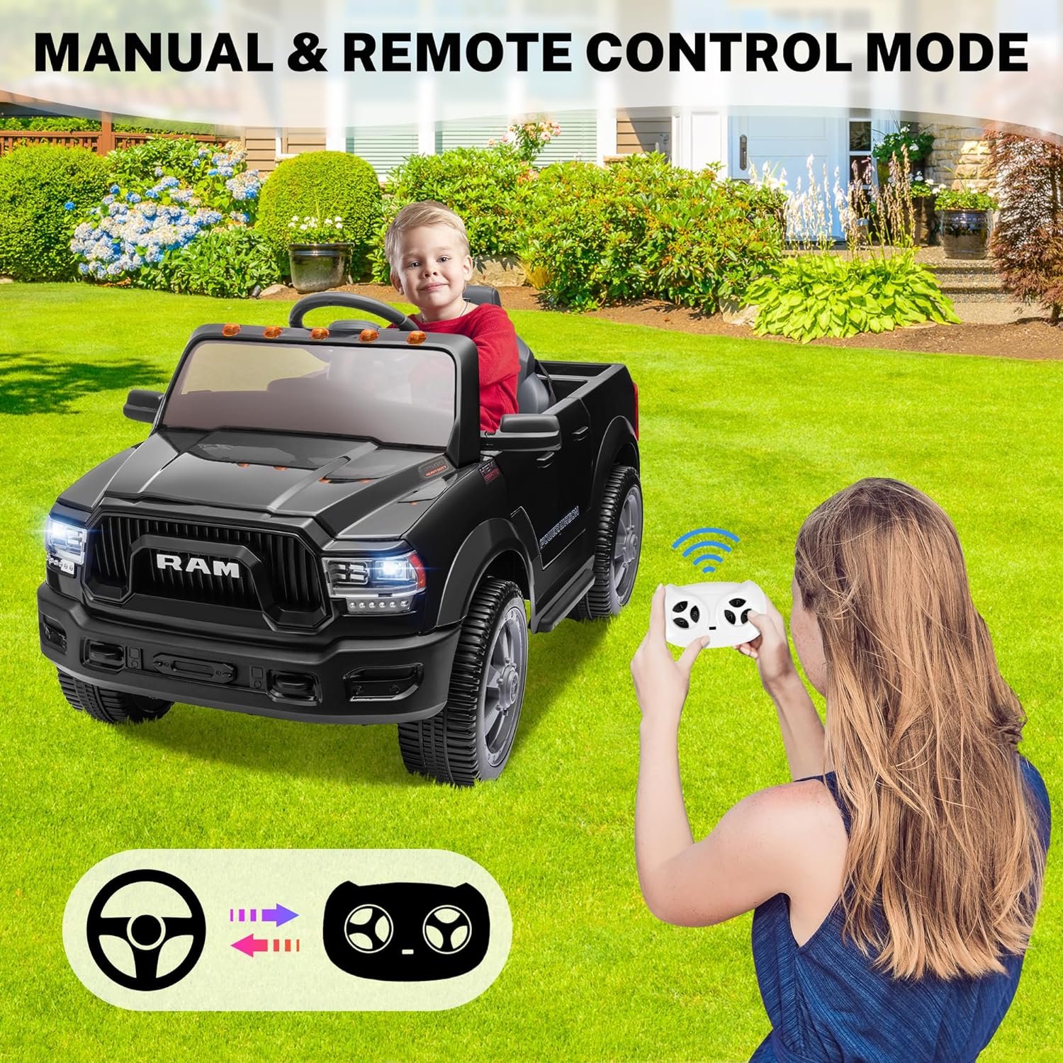 [Is This Car Officially Licensed by Dodge?] – Yes, this Dodge Ram 2500 ride-on electric car for kids restores the cool look of the real car and features with LED headlights, horn, engine sounds, openable doors, music player, back storage trunk and so on. All the details are designed to bring your children the most realistic and interesting driving experience. Just simply press the power button, select high/low speed, and press the pedal to drive forward/reverse.