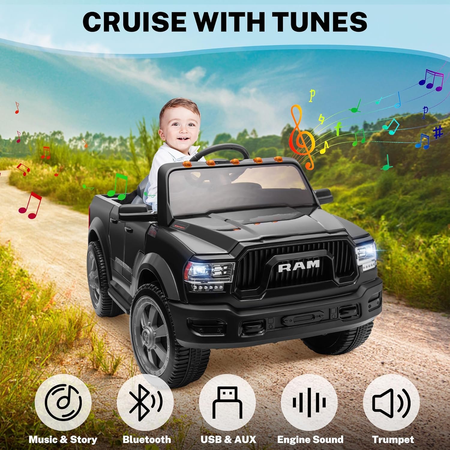 [The Entertainment Function of This Car?] – The 12V ride on toy car is designed with a music panel with a battery level display. In addition to playing several built-in music and stories, it also supports USB/AUX or Bluetooth connections to your other media devices. When the car lights up and plays your child’s favorite music, it’s sure to appeal to any toddler’s senses. Also, the led headlights, horn and startup sounds create a realistic ride to enjoy!
