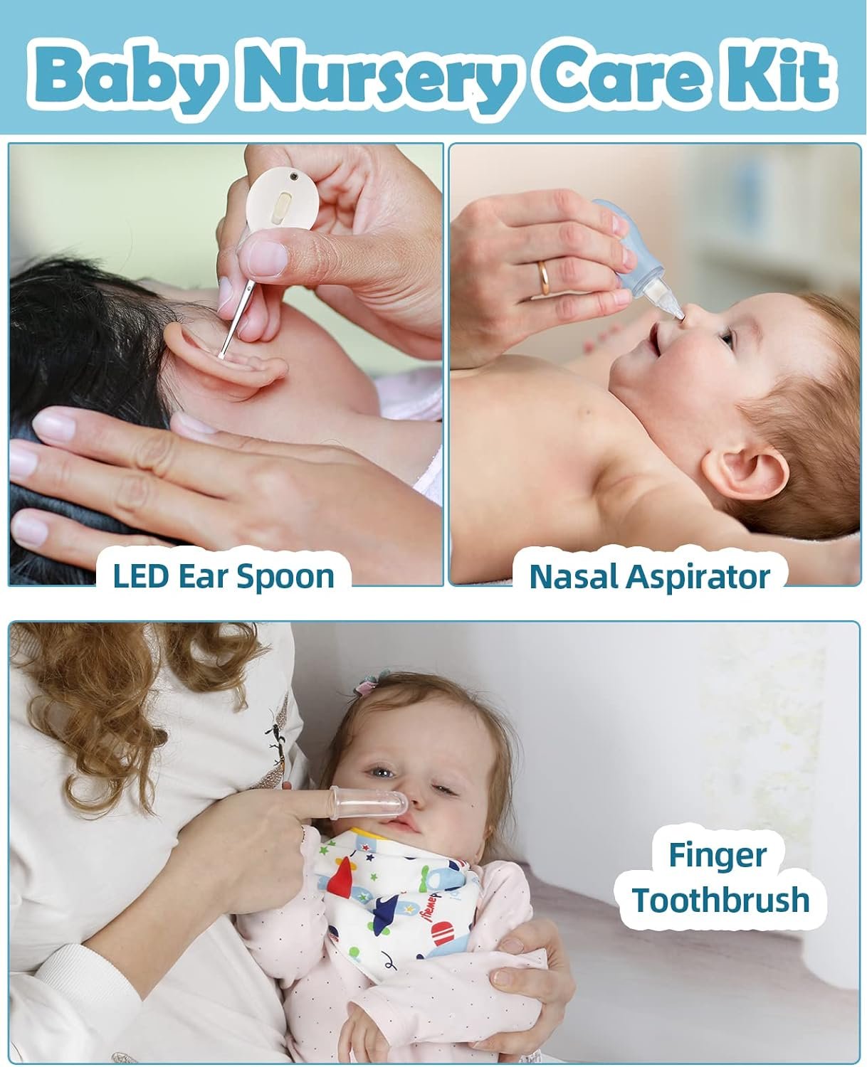 HIGH-QUALITY PRODUCTS AND THOUGHTFUL DESIGN: The baby earwax spoon comes with LED light function, make cleaning more thoroughly and safer, Scissors with round blades,gentle silicone toothbrushes suitable for sensitive gums, nasal suction devices that can easily clean nasal dirt, etc., provide the best daily care for your baby in all directions.