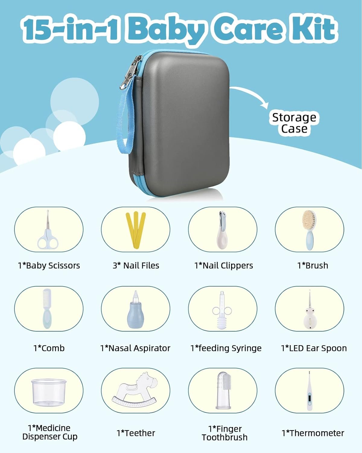 WHAT WILL YOU GET: branded services trusted by more than 2.2 million customers and a 15-in-1 baby safety care kit.The set includes:a Baby Hair Brush with Soft Goat Bristles,nail clipper, fillet safety scissor, nasal suction,baby comb, drug feeder (split design),finger toothbrush, earwax spoon LED light and nail files; Nice combination meet the baby’s daily demands.