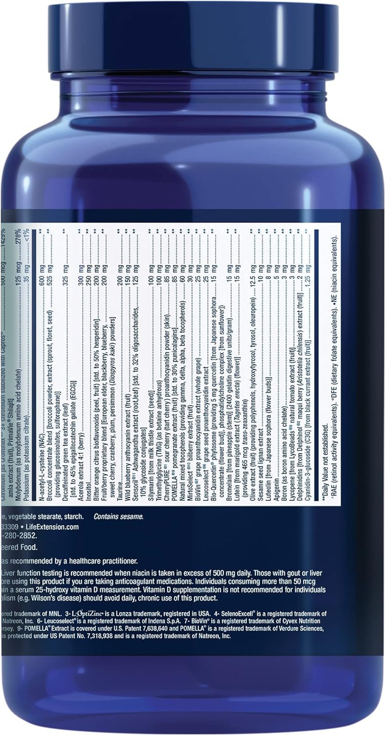 STATE-OF-THE-ART NUTRITION – Life Extension Mix goes above and beyond your daily vitamin and mineral needs. Pomegranate and green tea extracts, quercetin, and an advanced chromium complex help maintain cardiovascular health, immune health and more. Additional nutrients support eye, DNA and metabolic health, and fight oxidative stress to support a long, healthy life.