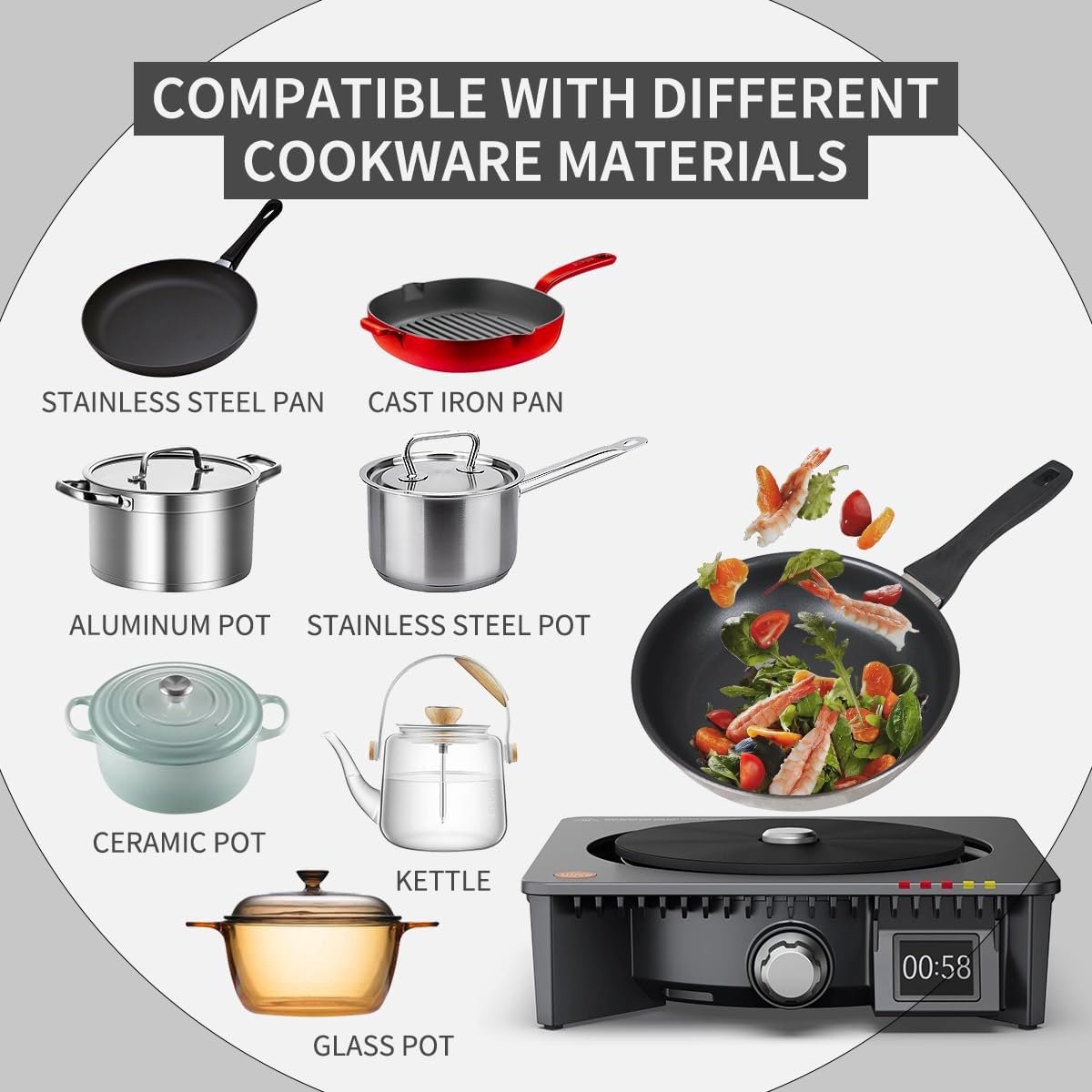 FITS DIFFERENCE COOKWARE MATERIAL – The cooker’s adjustable temperature control and precise heating capabilities ensure compatibility with different cookware materials. It can handle low-temperature cooking for delicate dishes or high-heat searing for browning and caramelization, accommodating the specific requirements of your cookware and recipes.