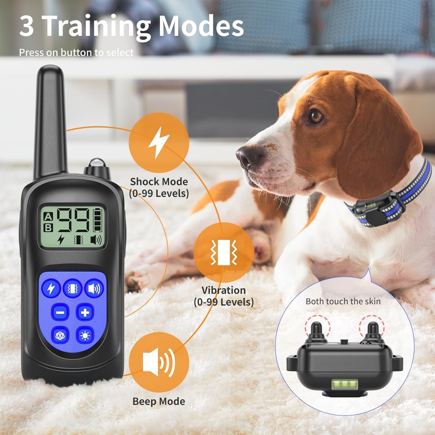 【Advanced Training Modes】: Designed with 4 extremely efficient harmless modes (Static Shock (0-99 levels), Vibration (0-99 levels), Beep, and Light mode). Use these shock collars for dogs with remote to teach your dog basic commands of obedience and help to correct barking, running, sitting, biting, fighting, aggression, and more bad behavior problems.