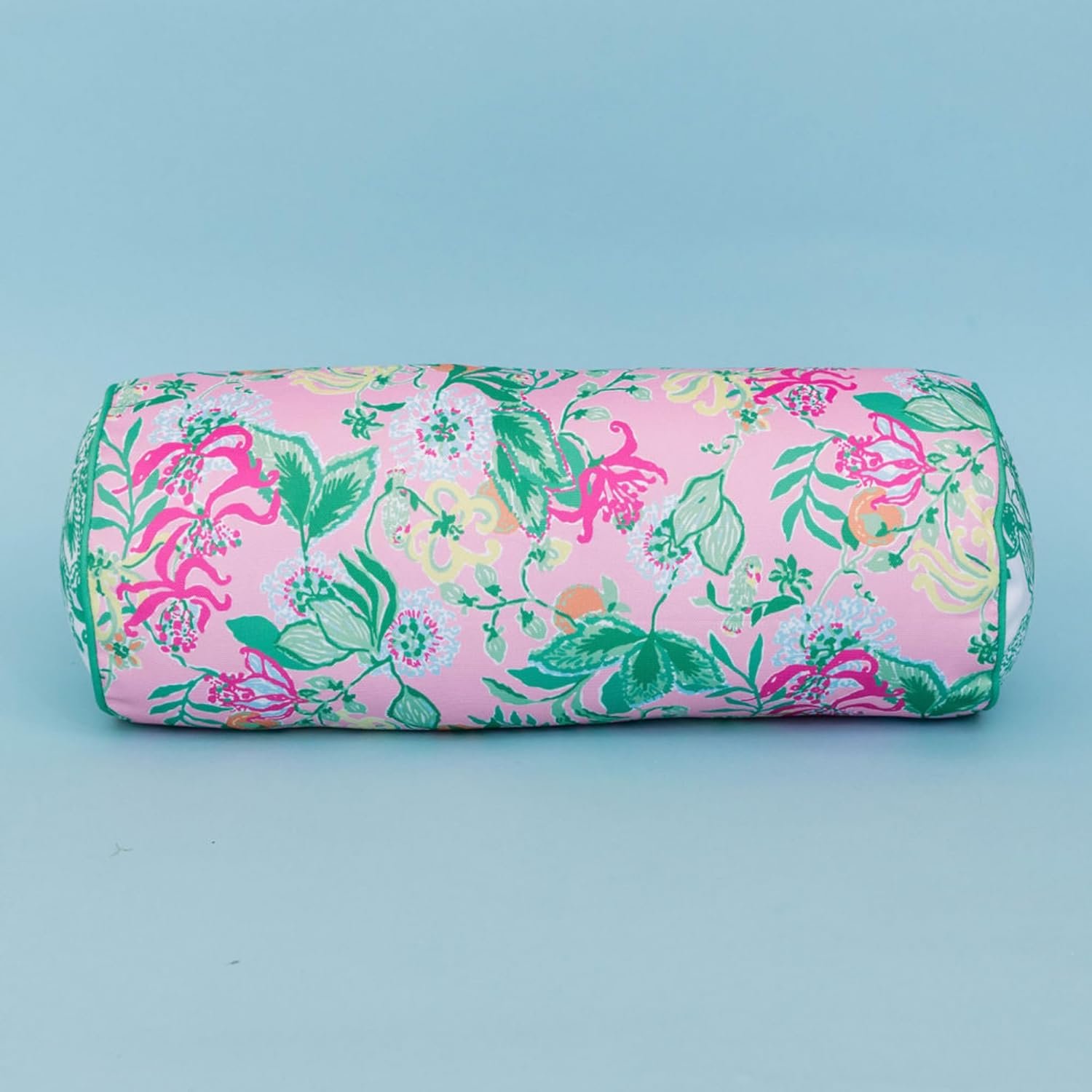 Bolster pillow for bed measures 21×8 and is constructed of a thick polyester material that is suitable for indoor use