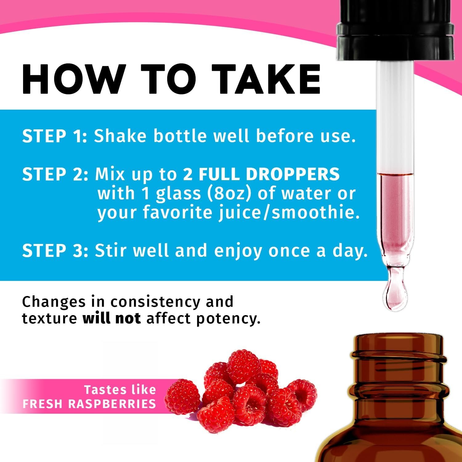 Shake Well Before Use – Take 2 droppers with 8oz of water once a day. Powder ingredients settling at the bottom is normal. These liquid biotin collagen drops feature a natural raspberry flavor.