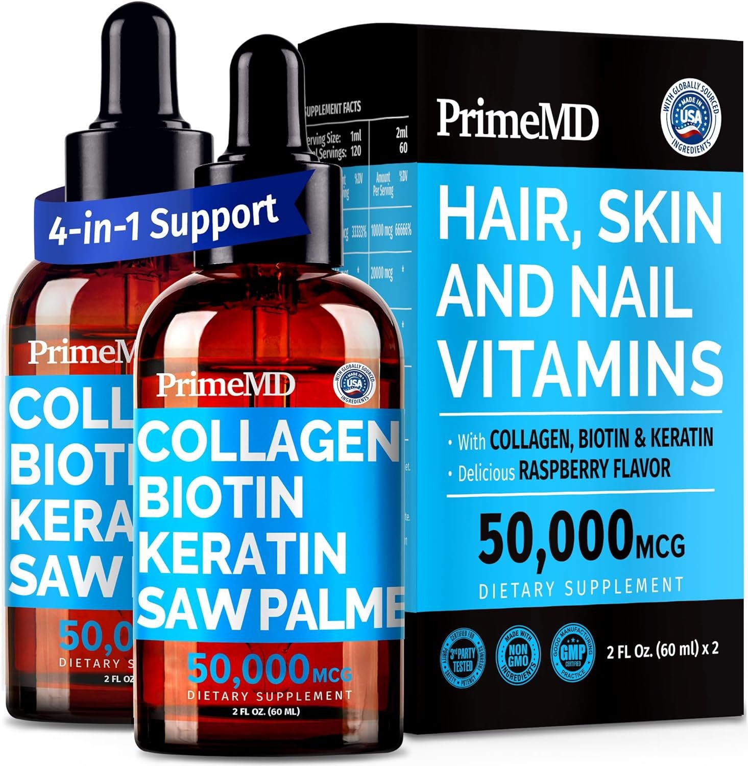 Liquid Collagen Peptides – 4 holy grail ingredients merge to support hair, skin and nails vitality. Each drop of our biotin liquid has collagen, Keratin, and Saw Palmetto to support a holistic routine for wellness and beauty.