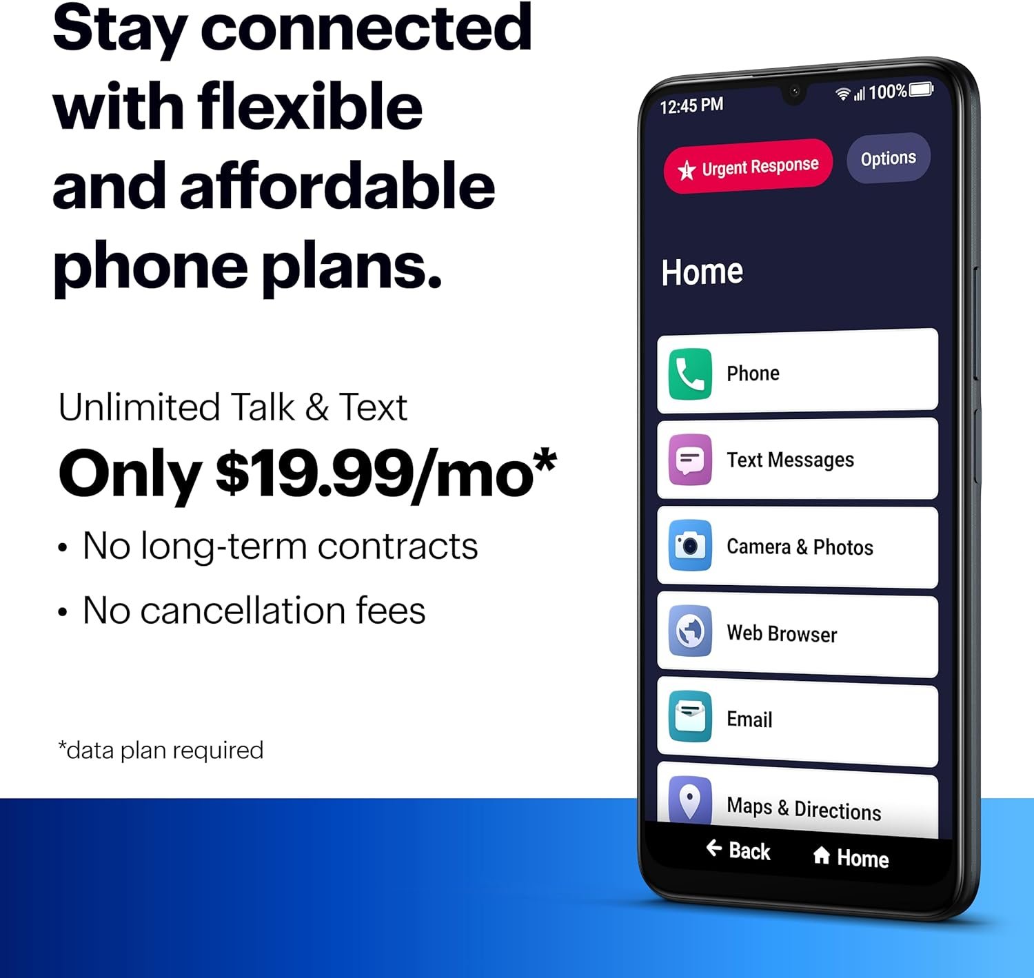 Simple Cell Phone: This is our simplest smartphone yet, with a larger 6.7” screen, easy-to-navigate menu, voice calling, real-time call captioning and Urgent Response button