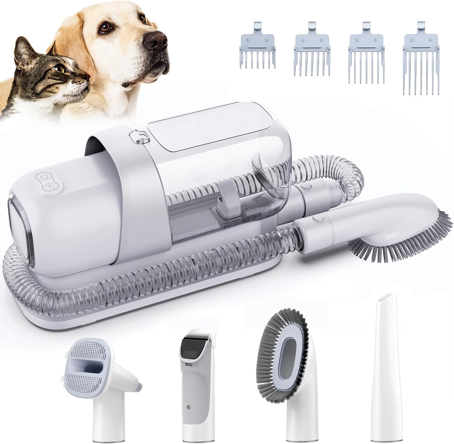 🐇【5 in 1 Pet Grooming Kit】➖ Multiple, easy to use attachments, including a slicker brush, a comb, clippers and guards, a fabric brush, and a hose. The electrical cord is nice and long, hose itself is a decent length, clippers are powered by wire in the hose, brilliant.