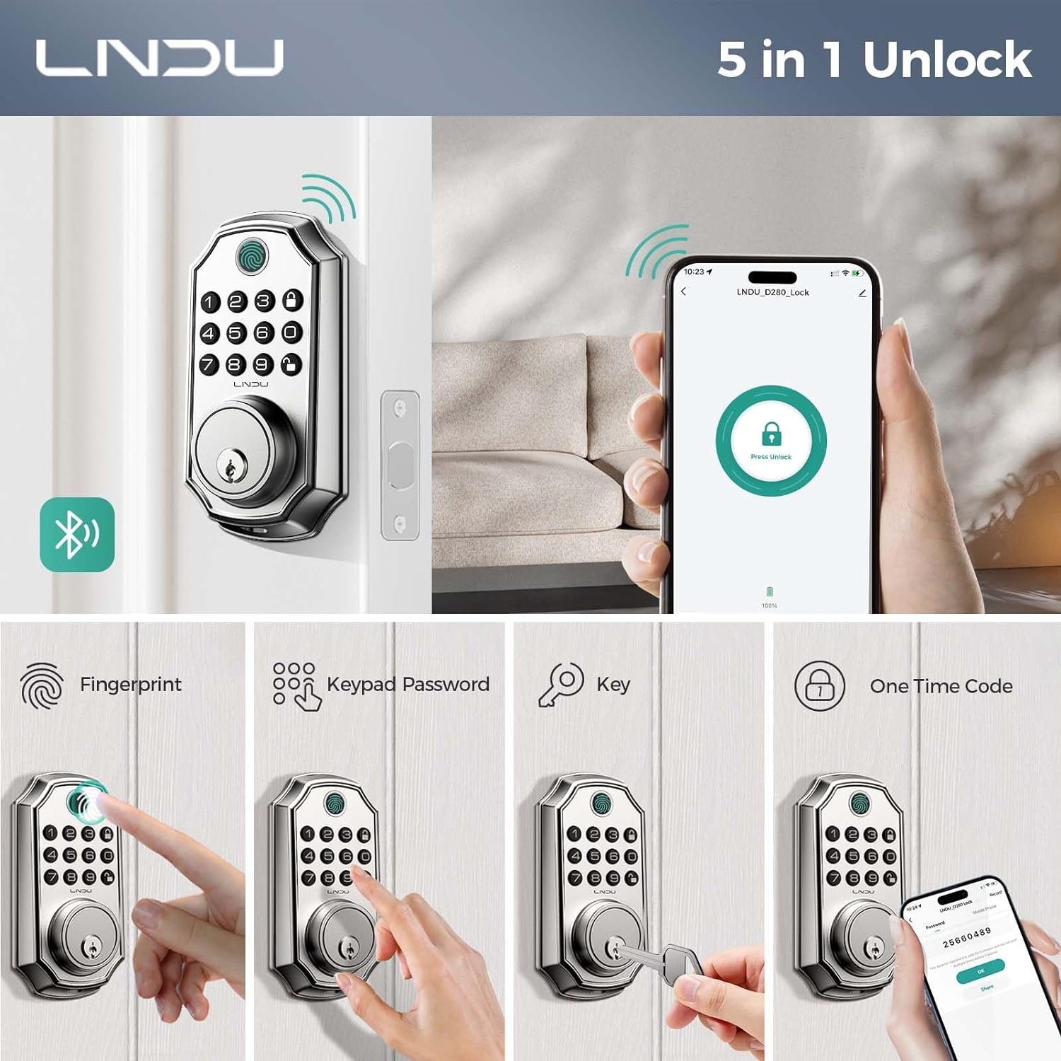 5 in 1 Unlock: Key less entry door lock supports five types of unlocking ways. 1. Fingerprint; 2. Bluetooth App control; 3. Keypad password; 4. Temporary password; 5. Key.