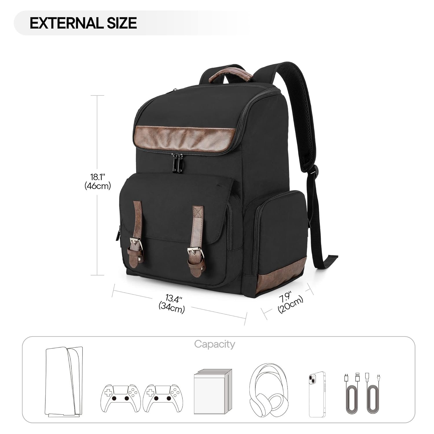Main compartment compatible with PS5/PS4/PS4 Pro/PS4 Slim/Xbox One/Xbox One X/Xbox One S2 side pockets can store game discsFront pocket for the game controller and accessories.