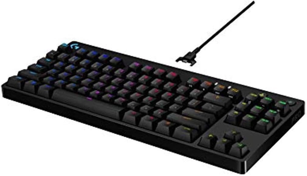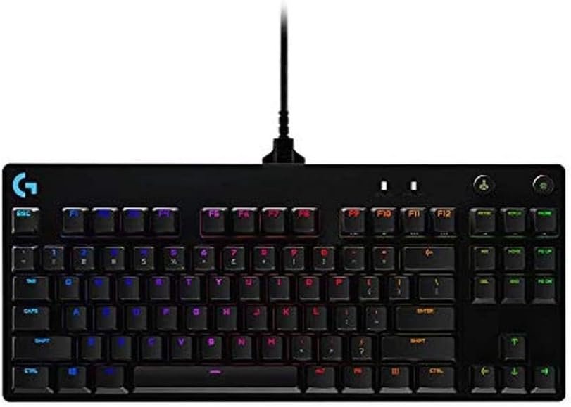The Logitech G Pro X Tenkeyless mechanical gaming keyboard uses tactile and quiet GL Brown switches, detachable USB cable, RGB backlighting, and software for macro programming.