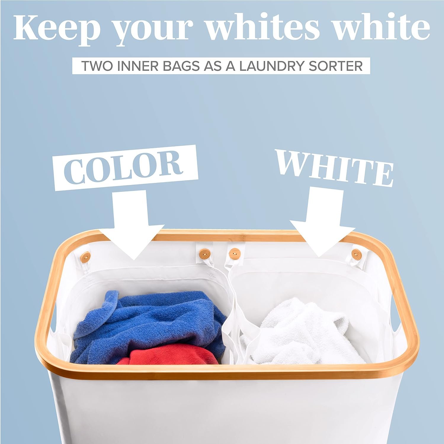 SPACIOUS AND COLLAPSIBLE: With a generous two section compartments and a total capacity of 39.6 Gallons (3-5 Loads). Whether accommodating a large load or saving space when not in use, this feature ensures practicality and adaptability to your storage needs. Experience the perfect blend of spaciousness and collapsible convenience for a truly efficient and versatile organizational solution.