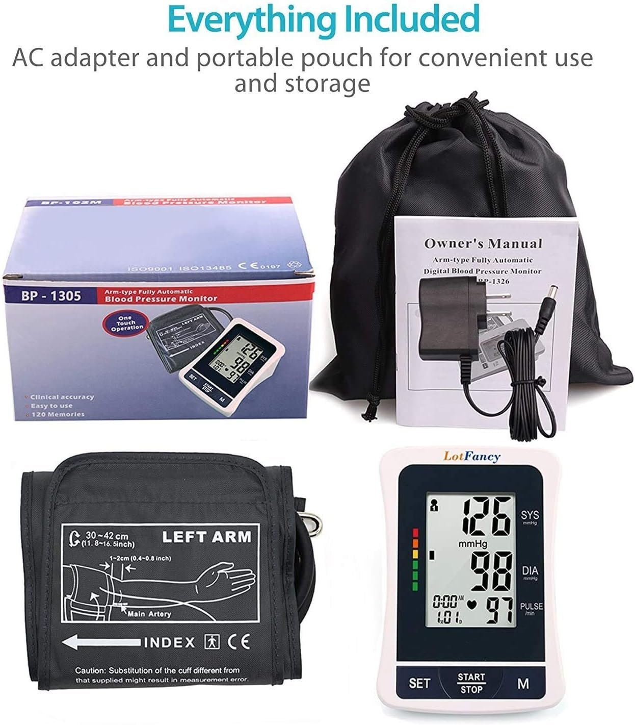 COMPACT & PORTABLE: Our BP detector kit include: 1 x Blood Pressure Monitor, 1 x Cuff, 1 x Instruction Manual, 1 x Quick Start Guide, 1 x AC Adaptor, 1 x Storage Pouch. Compact and portable design makes it convenient for daily use at home or in travel
