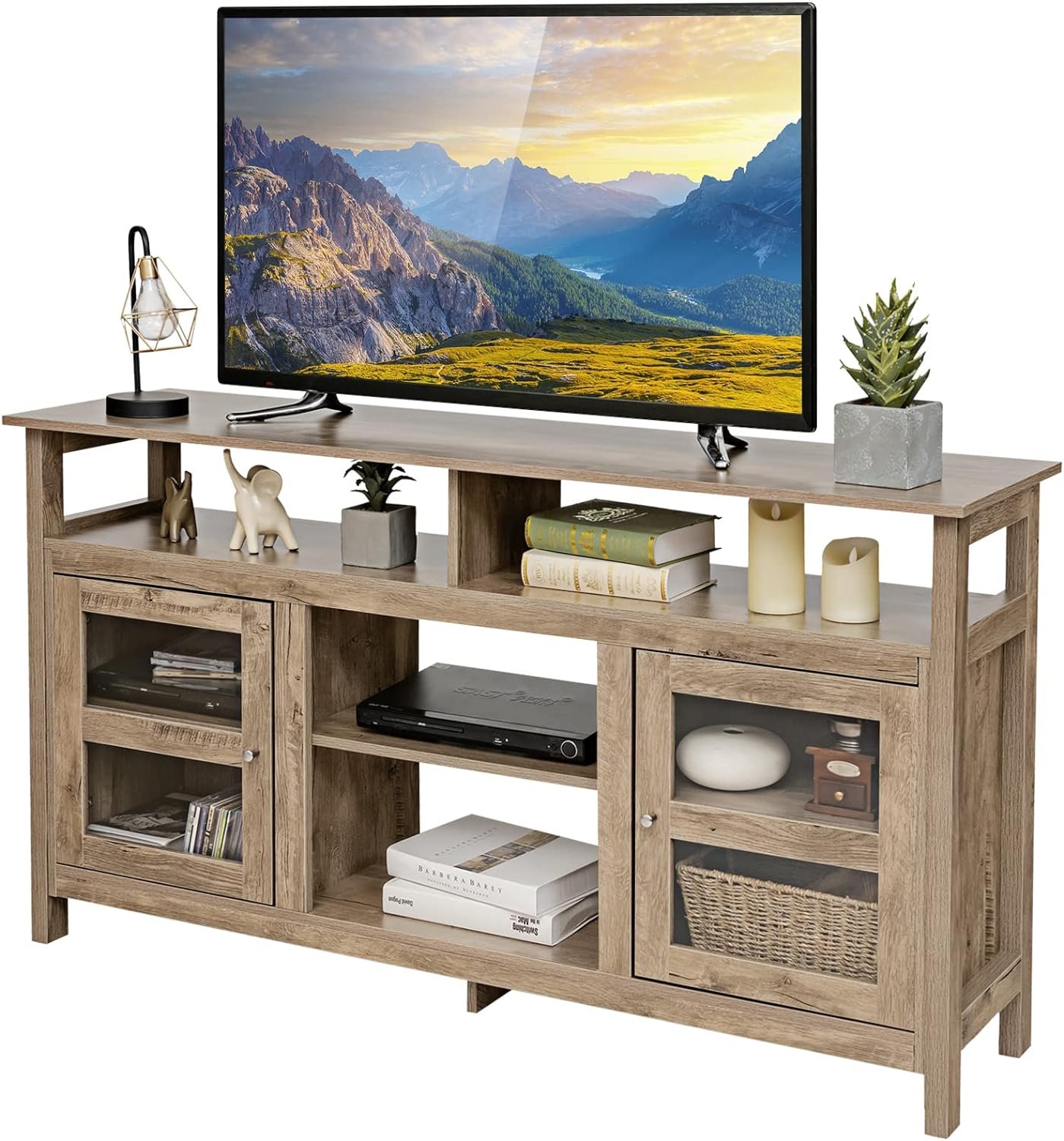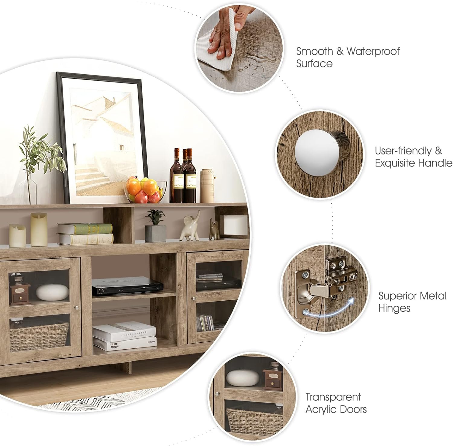 Versatile Storage Space: With 2 side cabinets with 2 shelves and 4 open storage shelves, the TV cabinet has enough storage space for storing various items in a reasonable way. The wide top of the TV cabinet can hold decorative items such as potted plants, in addition to a TV up to 65 inches.