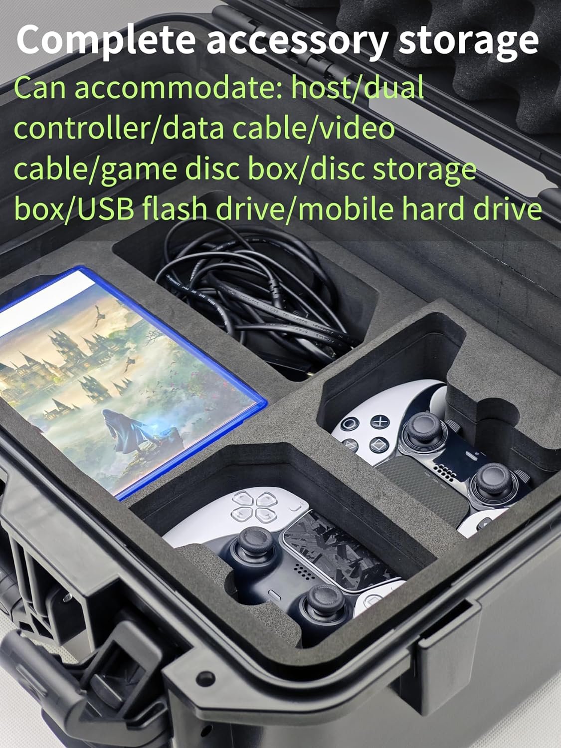 【CUSTOM FOAM INTERIOR】The interior is made of military grade high-density EVA foam, and is PRE-CUT to perfectly fit ps5,foam cutouts that provide shock-absorbing protection on each layer and keep your Playstation 5 console as well as accessories secure during transit or travel.