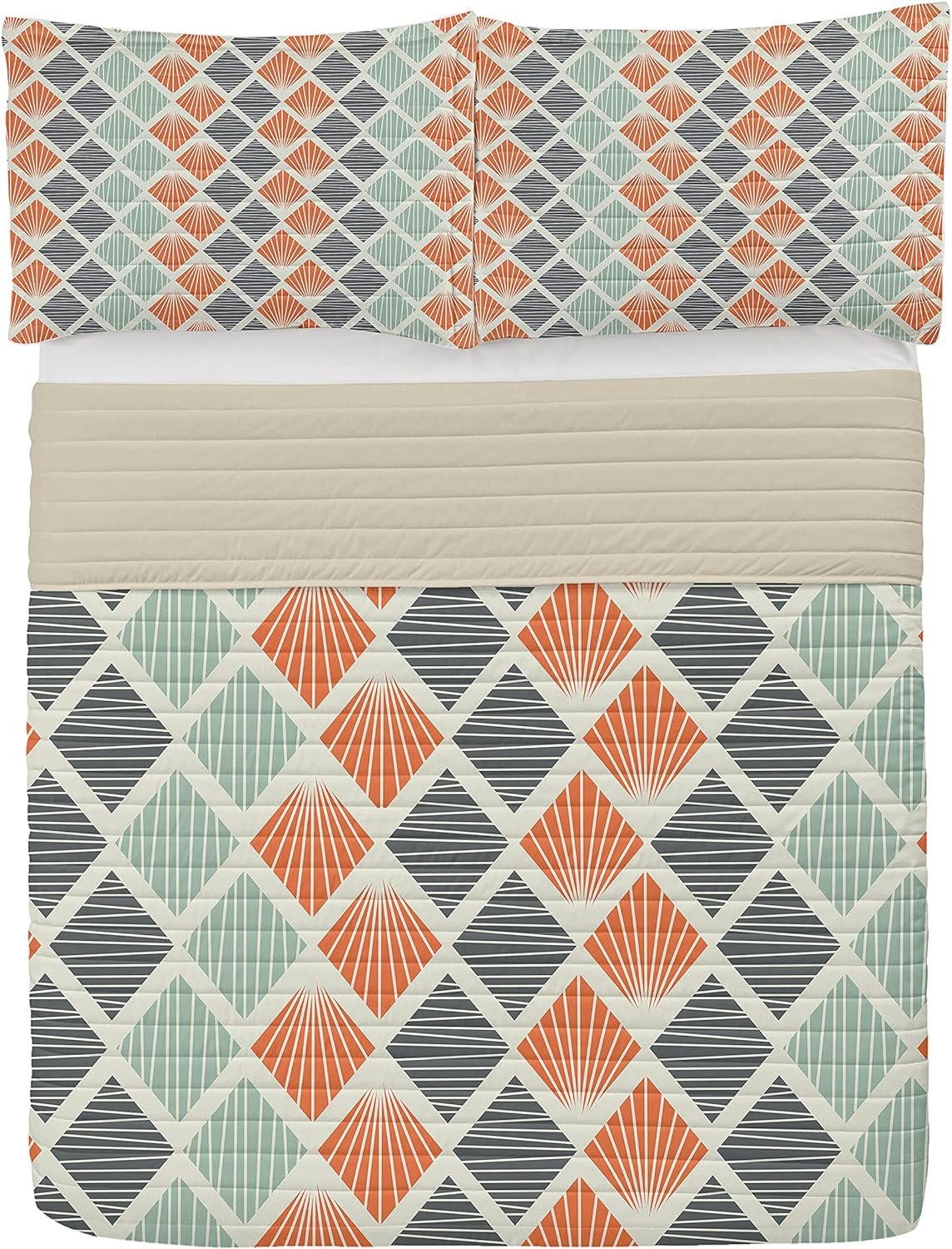 Lunarable Geometric Microfiber Bedspread Set, Pop Art Style Retro Rhombus Fractal Stripes Nostalgic Graphic Print, Soft Bedding Set with Pillow Shams & Comforter, King Size, Orange Almond Green