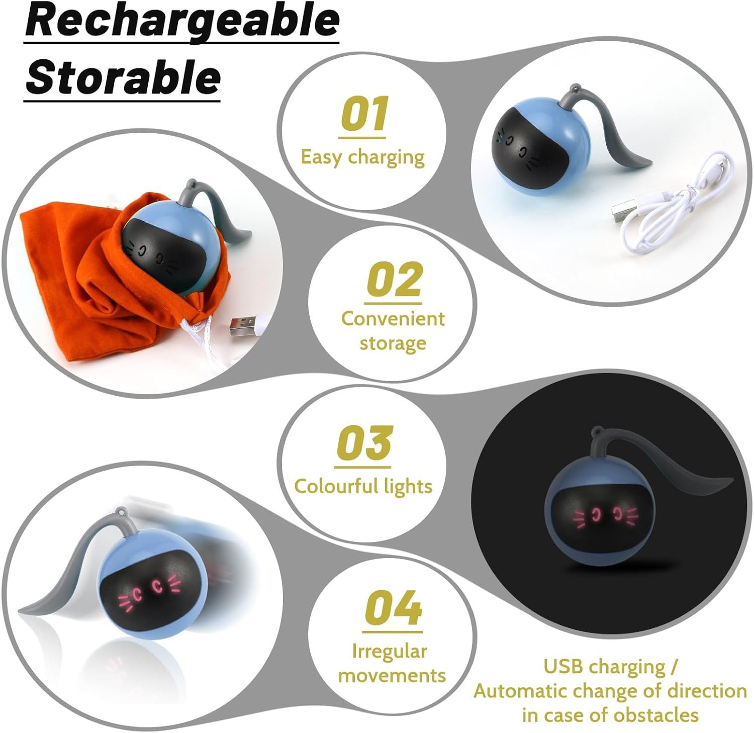 HIGH QUALITY MATERIAL: This cat toy ball is made of high quality ABS material, which can prevent cats from scratching and biting, and the rechargeable design can prolong the service life of the cat toy ball, durable.