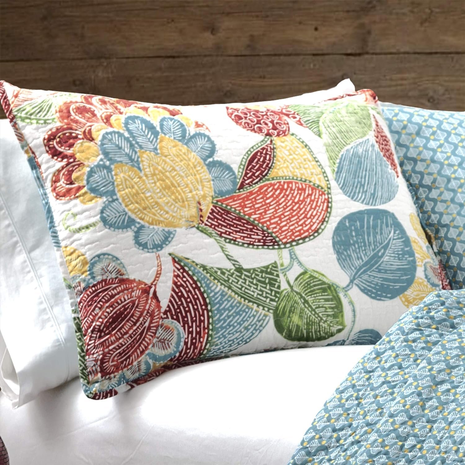 Colorful shades of orange, blue, and yellow quilt bedding with large leaf and floral design.