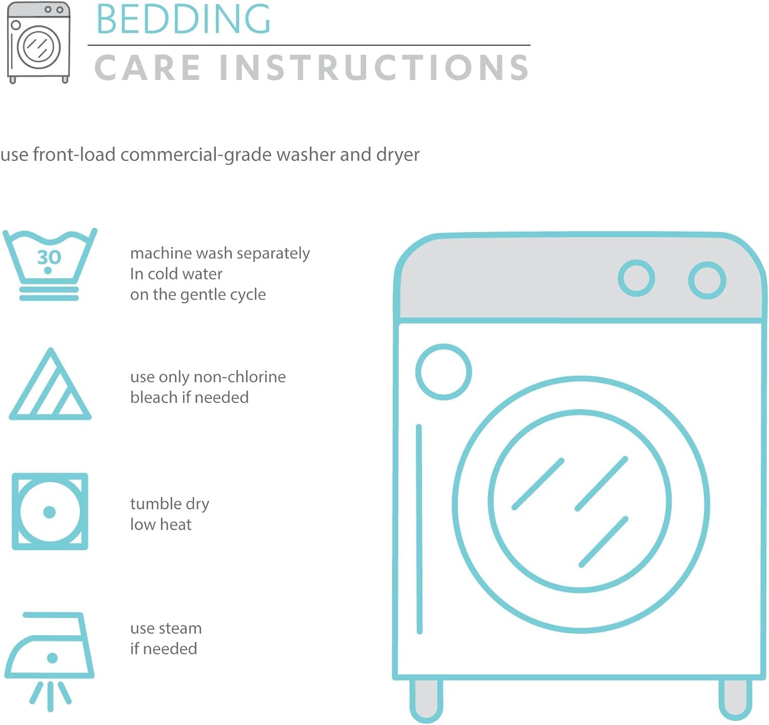 Easy Care: This bedding set is easy to maintain. Simply machine wash separately in cold water on the gentle cycle. Tumble dry low. Use only non-chlorine bleach if needed. Use a steamer to release wrinkles if needed.