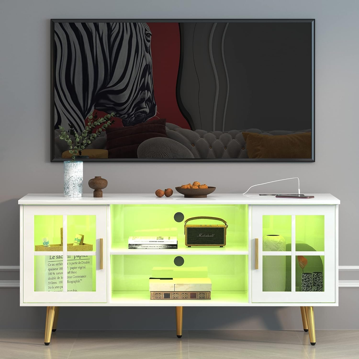 📺【 High-quality materials 】 LVSOMT LED TV cabinet is made of high-quality MDF board and solid glass. High-quality hardware table feet, High-transparent glass cabinet door, unique, beautiful, and creative. Holes designed for hiding unsightly wires, say goodbye to clutter.