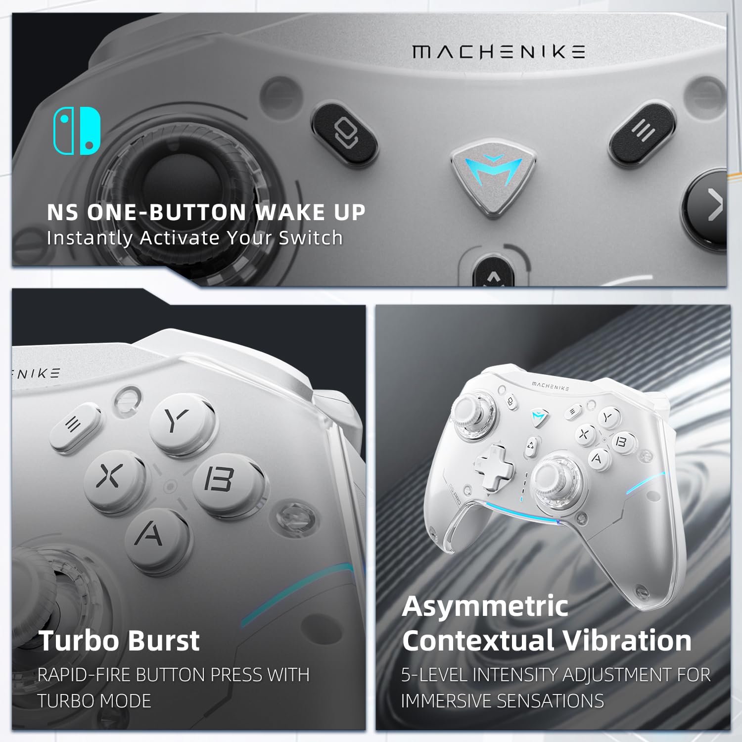 Joystick Upgraded Hall Effect Joystick game controller Triggers FULL HALL EFFECT TRIGGER,Electromagnetic Trigger control,Precision Linear Response After-sales service Please feel free to contact our support team if you have any problems or concerns: 1.Read the Machenike store page introduction, by amazon message. 2.By Machenike FB account. Online Support All of Machenike products have been covered repair or replacement of the broken unit for a period of 12 months from the date of purchase and with lifetime online support. Software G5 pro pc game controller support both: pc machenike space station and mobile game center where you can customize your controller configuration. Connection Method Wireless Adapter connection, Bluetooth connection,Wired connection 6 Macros Buttons 2 Elite Back Buttons + 4 Programmable Marco Buttons Battery Capacity 3.7V/600mAh Charging Time Approx.2-4 hours Use Distance Range ≤8M Platform Switching One Key on Back for Platform Switching Response Rate Wireless 500/Wired 500 & 3ms Ultra Low Latency Mapping Function High-Precision Six-Axis Gyro Mapping with G5 PRO gaming controller