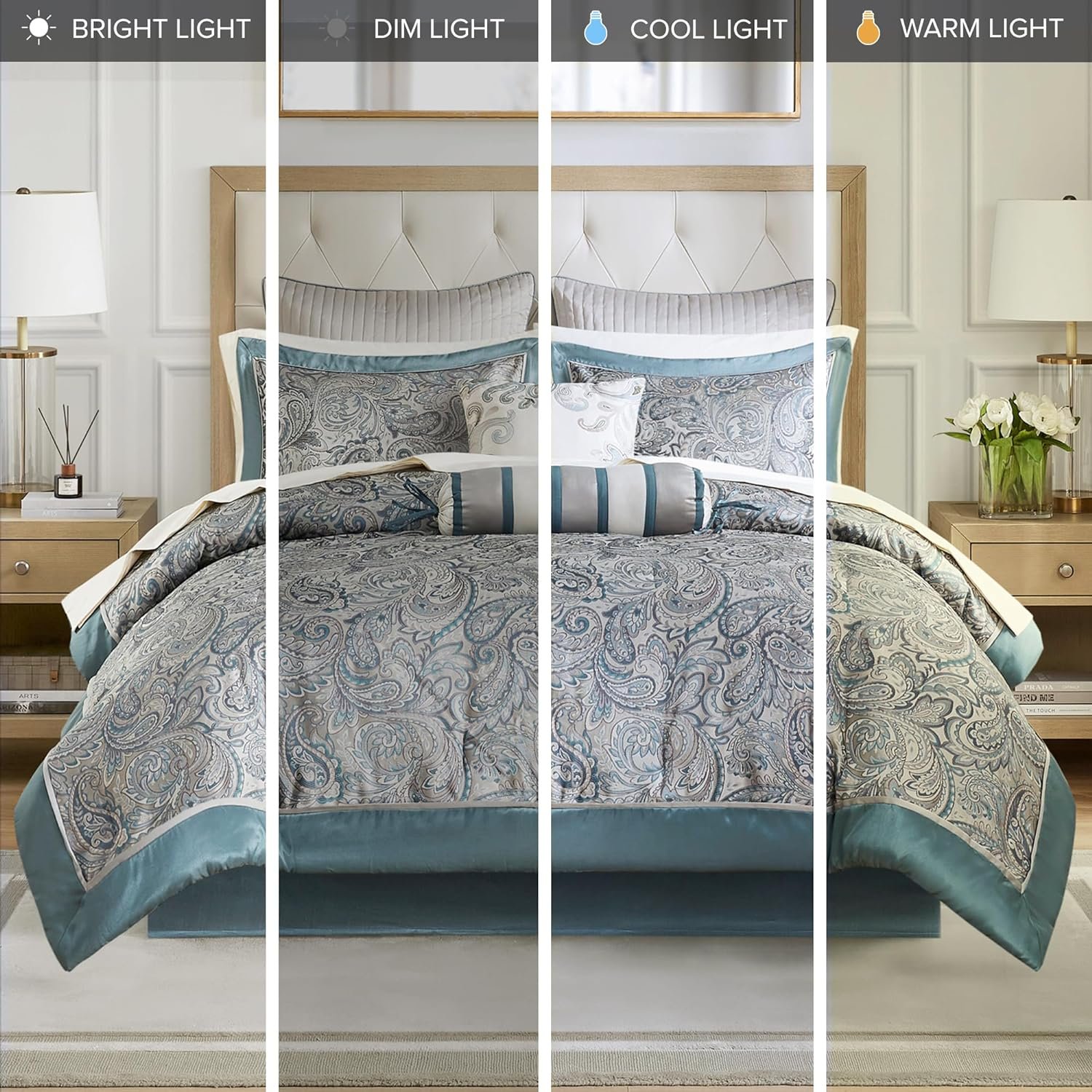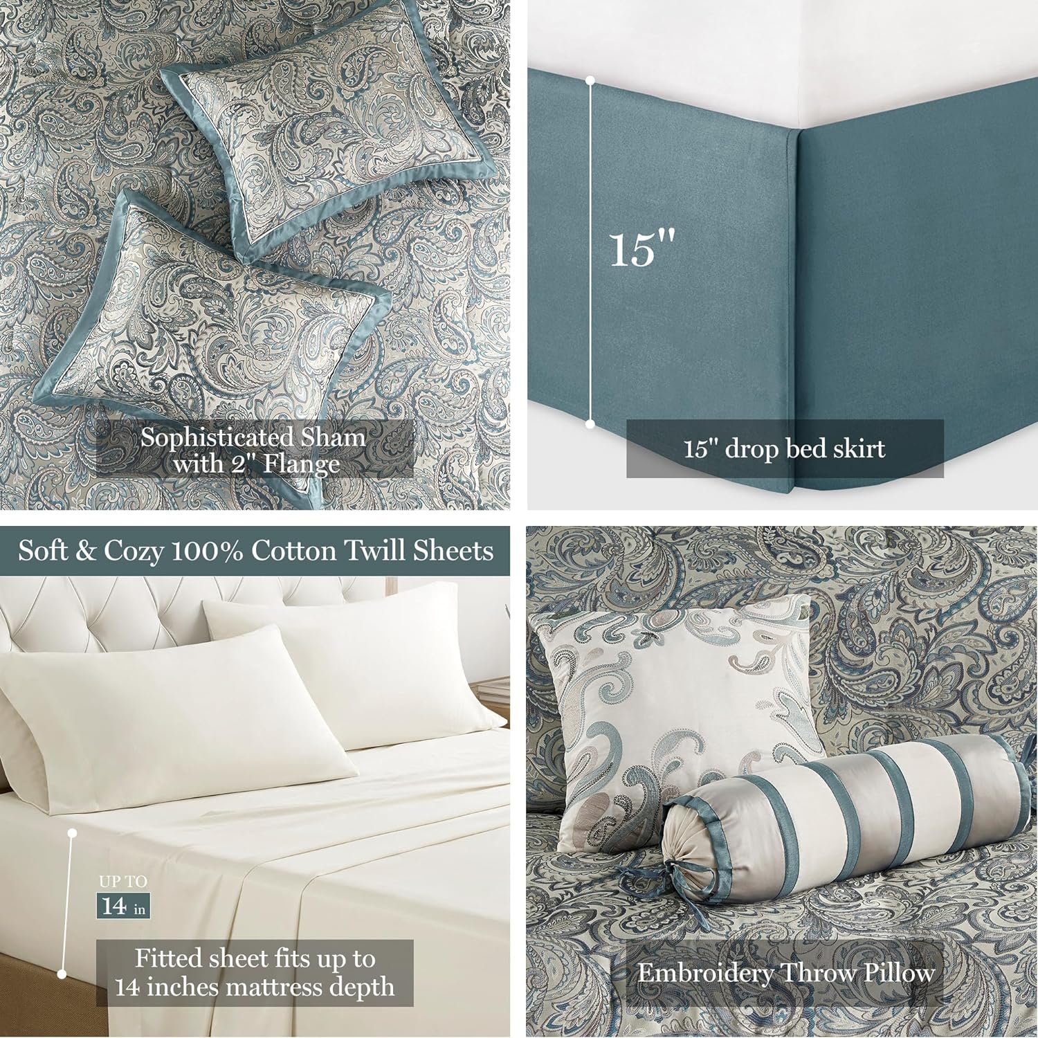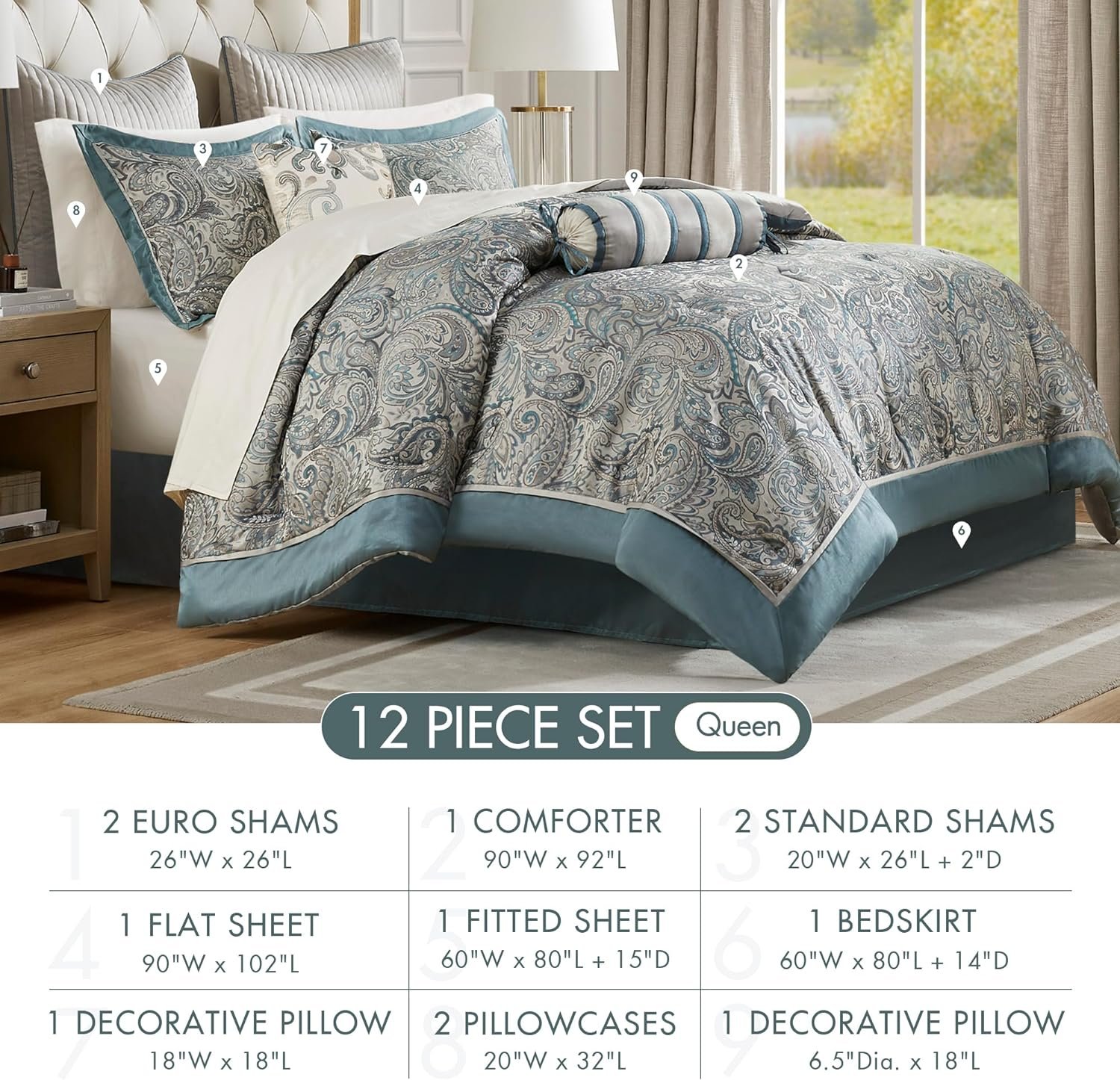 Madison Park Aubrey Cozy 12 Piece Comforter Set & Sheet, Luxe Faux Silk Jacquard Paisley Design – All Season Down Alternative Bedding with Cotton Bed Sheets, Bedskirt, Toss Pillows, Queen Teal