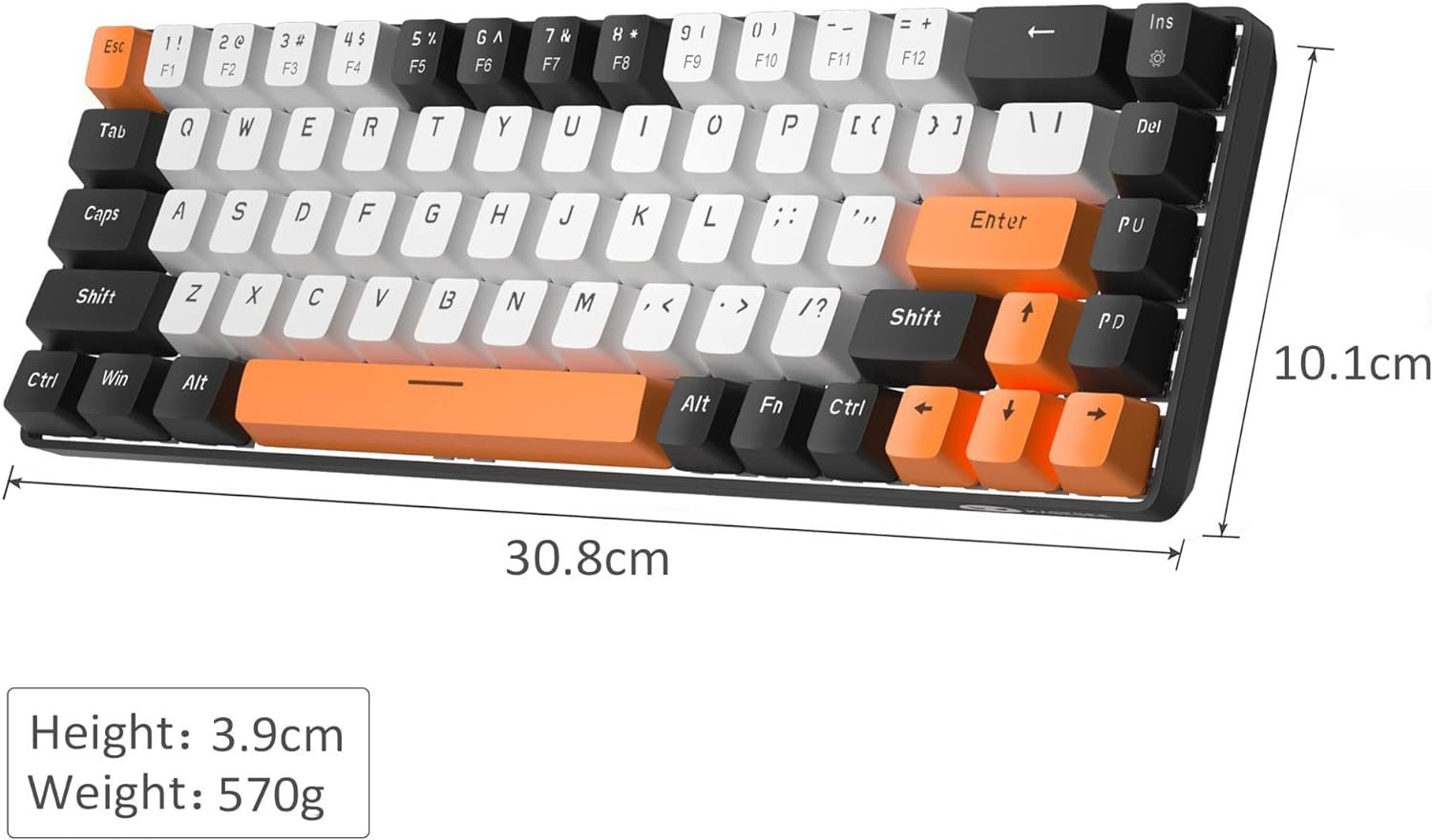 Full anti-ghosting keyboard: all 68 keys are no conflict, white black orange mash up design, ergonomic suspension double-color injection keycap, double kickstand feet adjustable typing angle and detachable usb cable, both practical and beautiful.