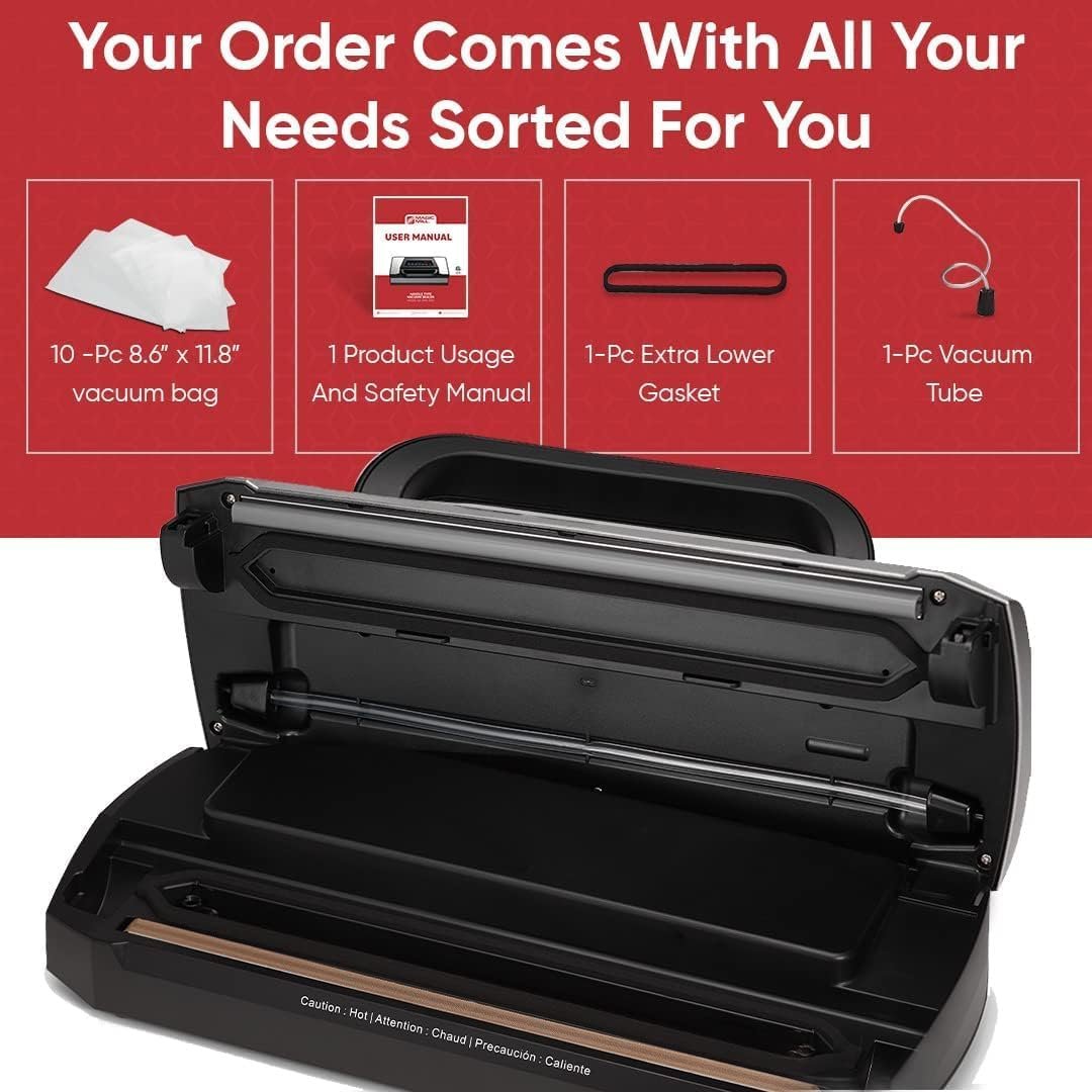 Extra Starter Kit – Aside from the Vacuum Sealer, the product package also comes with 1- roll 8.6″ x 11.8″ food saver vaccum bag, 1 Vacuum Tube, 1-piece hand cutter, 1-piece extra lower gasket, and Product Usage and Safety Guidelines. The product has a 1-year Warranty, and for any inquiries about the product, you can always contact customer service.