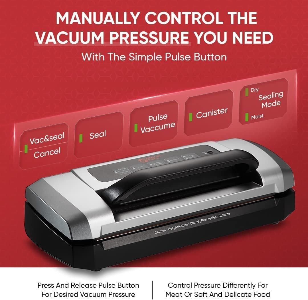 Easy to Use Operation – The Vacuum Bag Sealer uses a simple Press and Release Pulse Button. You can easily control vacuum sealing bags by pressing the Pulse Button and releasing it when the desired vacuum pressure is met. As a result, vacuuming different kinds of food like meat or soft and delicate food is made more accessible.