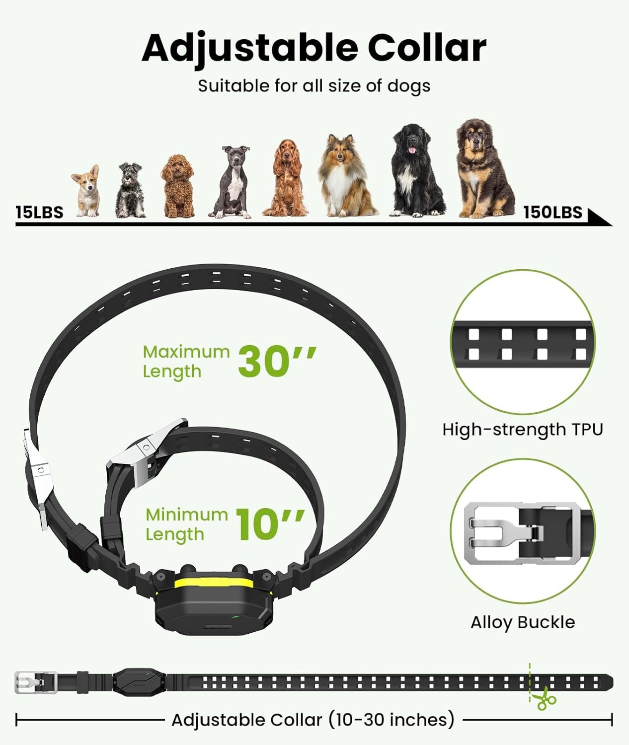 Fits All Dog Sizes & Comfort: Our dog collar fits neck sizes from 10 – 30 inches and weights from 15 – 150 lbs. Adjustable collars fit all large, medium and small dogs. Collar strap is made of soft and durable TPU material to keep your dog comfortable