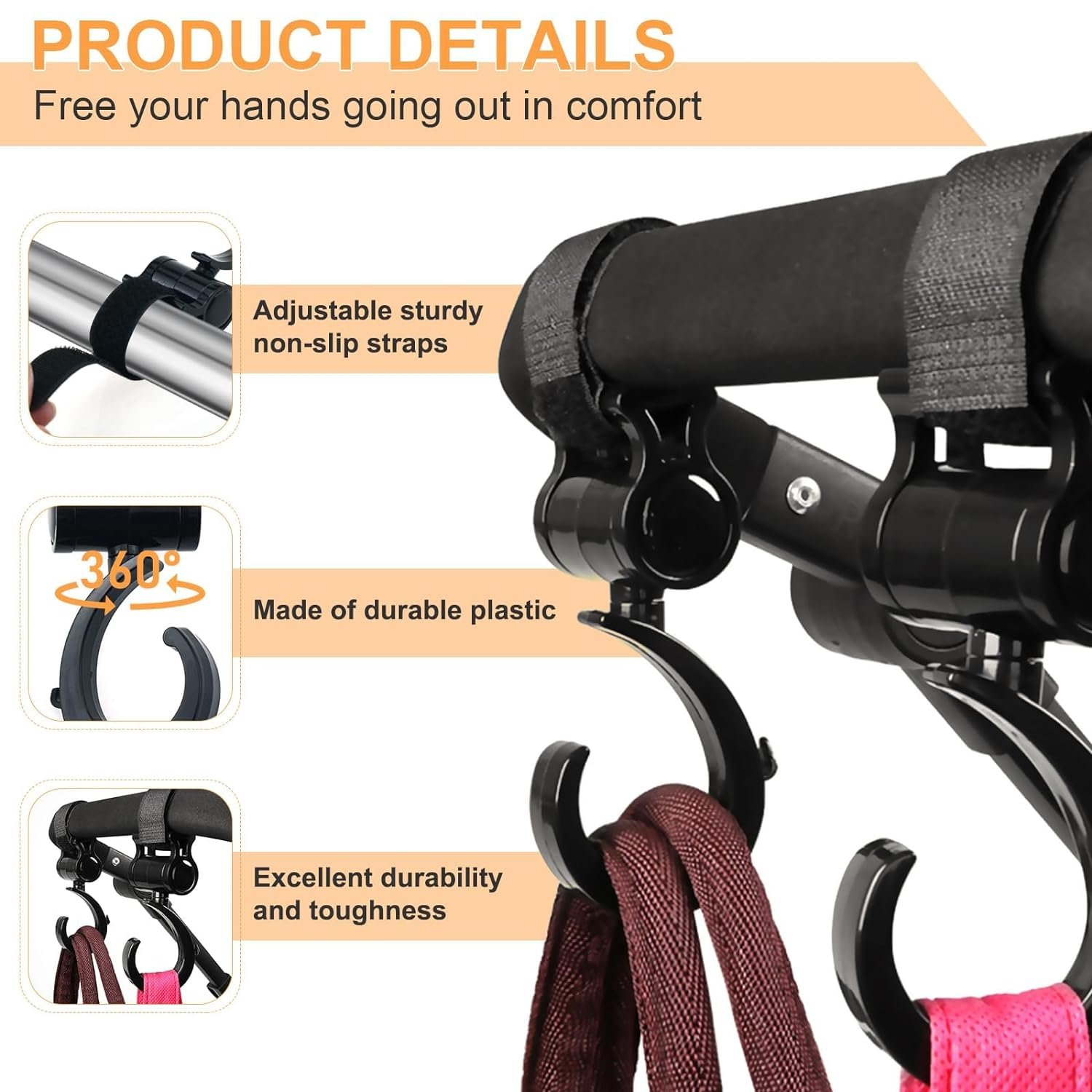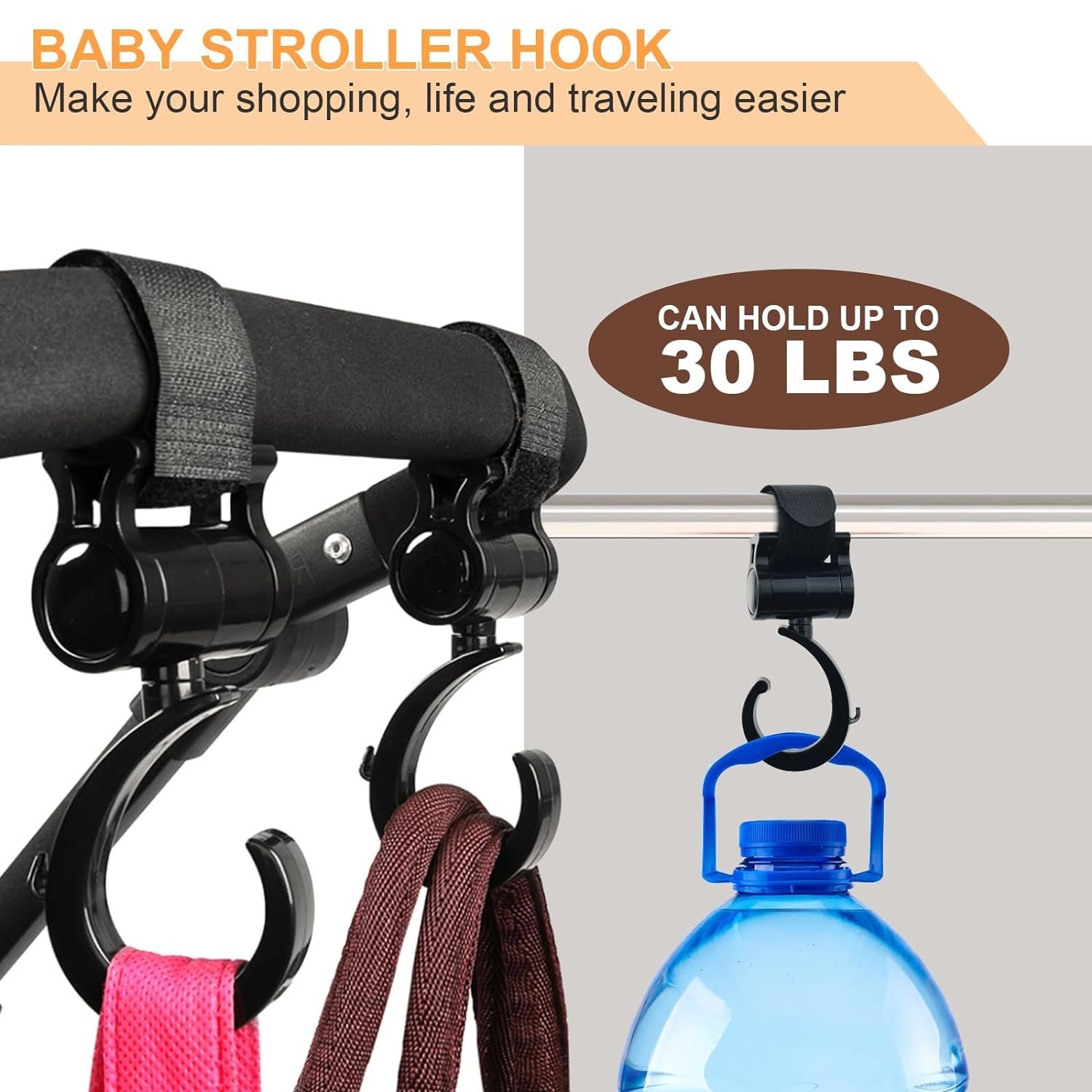 ❤️ Versatile Uses – Multipurpose accessory can be attached to walkers, wheelchairs, strollers, walkers, car seats, strollers, bikes while jogging, walking, shopping and biking. Simply hang your groceries on the hooks.