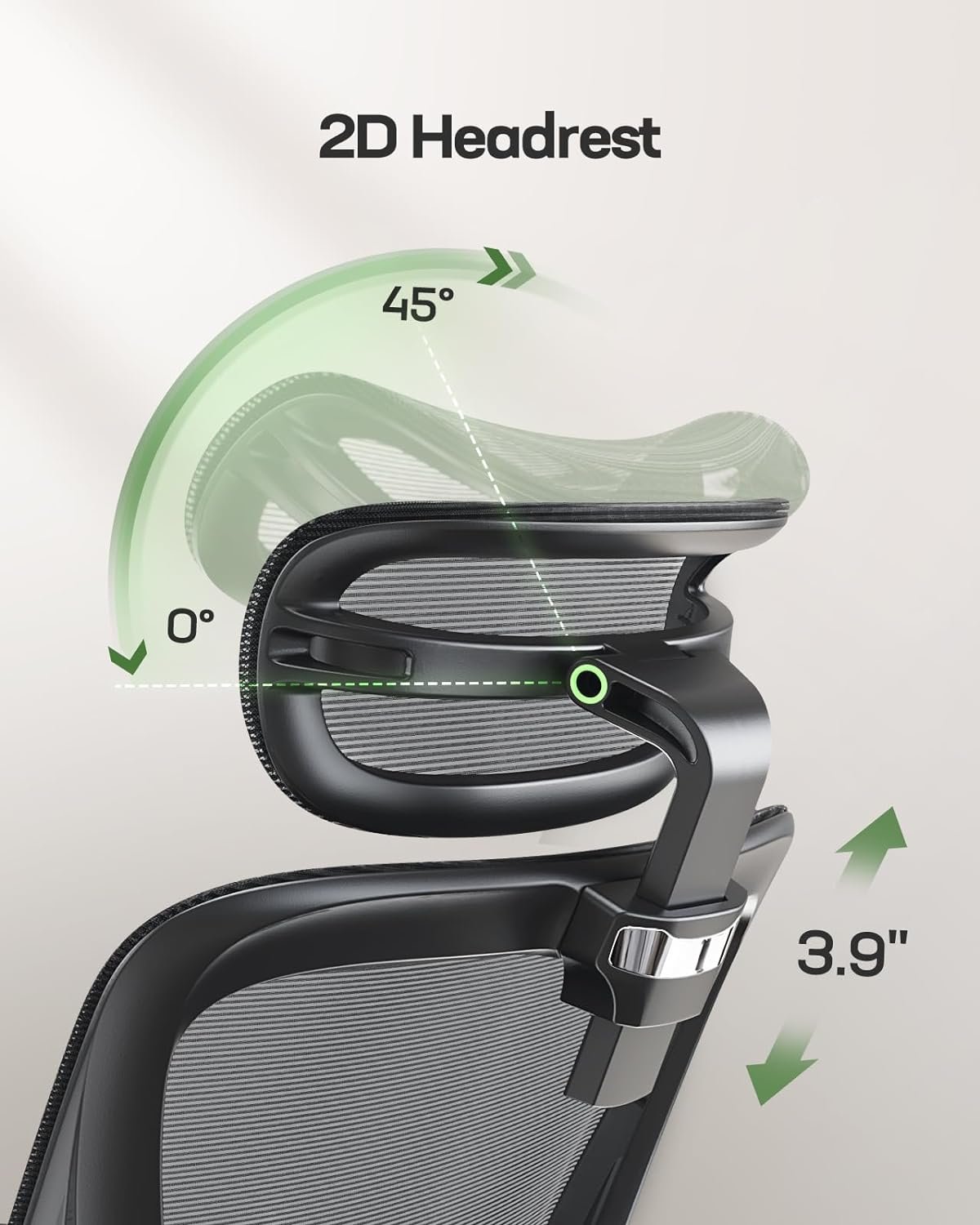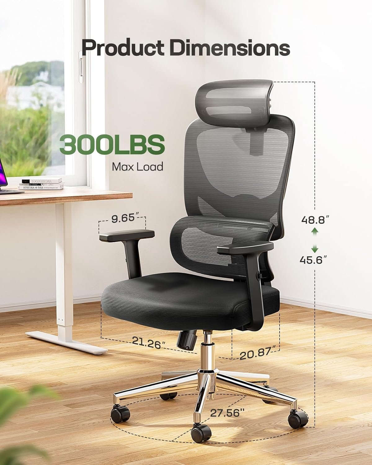 【Fully adjustable office desk chair】All the adjustments you need can be found in this mesh office chair. The high back office chair comes with 2D headrest, 90-135°rocking and 3-angle positions tilt lock, 2D up/down adjustable armrests, adjustable chair height and back height, so that people of different heights (4’11″to 6’3″)can find the most comfortable postures