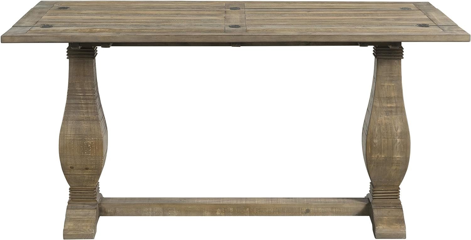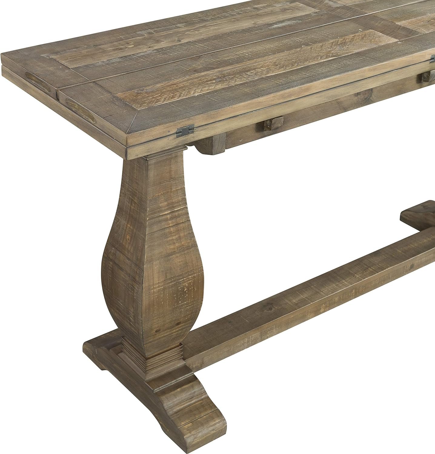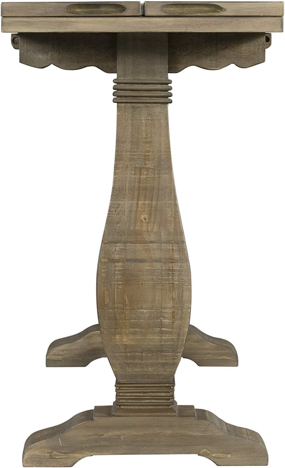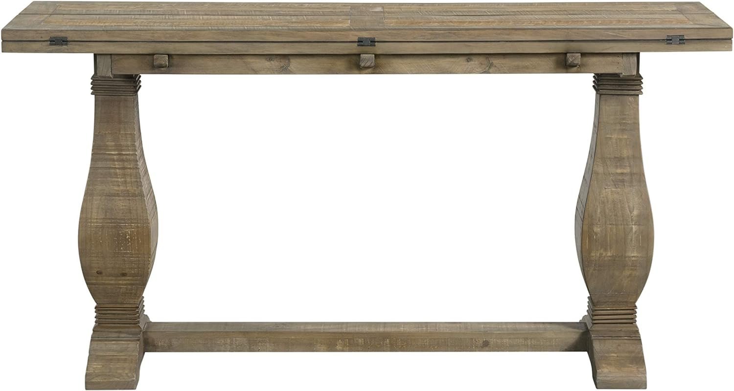 The Napa Flip Top Console Table offers a casual farmhouse style with a pedestal base. This table features a versatile design which allows for the table to be used three different ways: standard sofa table, desk or dining table. Two leaves run length wise on the table and when one leaf is flipped down the table is the perfect size for writing desk. When both leaves are opened, the table turns into a nicely sized dining table. This is the perfect space saving farmhouse style table. The table is constructed of reclaimed or salvaged style New Zealand Pine and finished in a Reclaimed Natural finish. The eye-catching legs feature a classic baluster style leg with additional carved details. The 2” thick tops are detailed with a plank design and natural wormwood and purposeful distress marked details. Assembled product dimensions: 60″ W x 18″ D x 30″ H. Fully opened dimensions: 60″ W x 36″ D x 30″ H. Product materials: New Zealand Pine. Easy to assemble. Made in Vietnam.