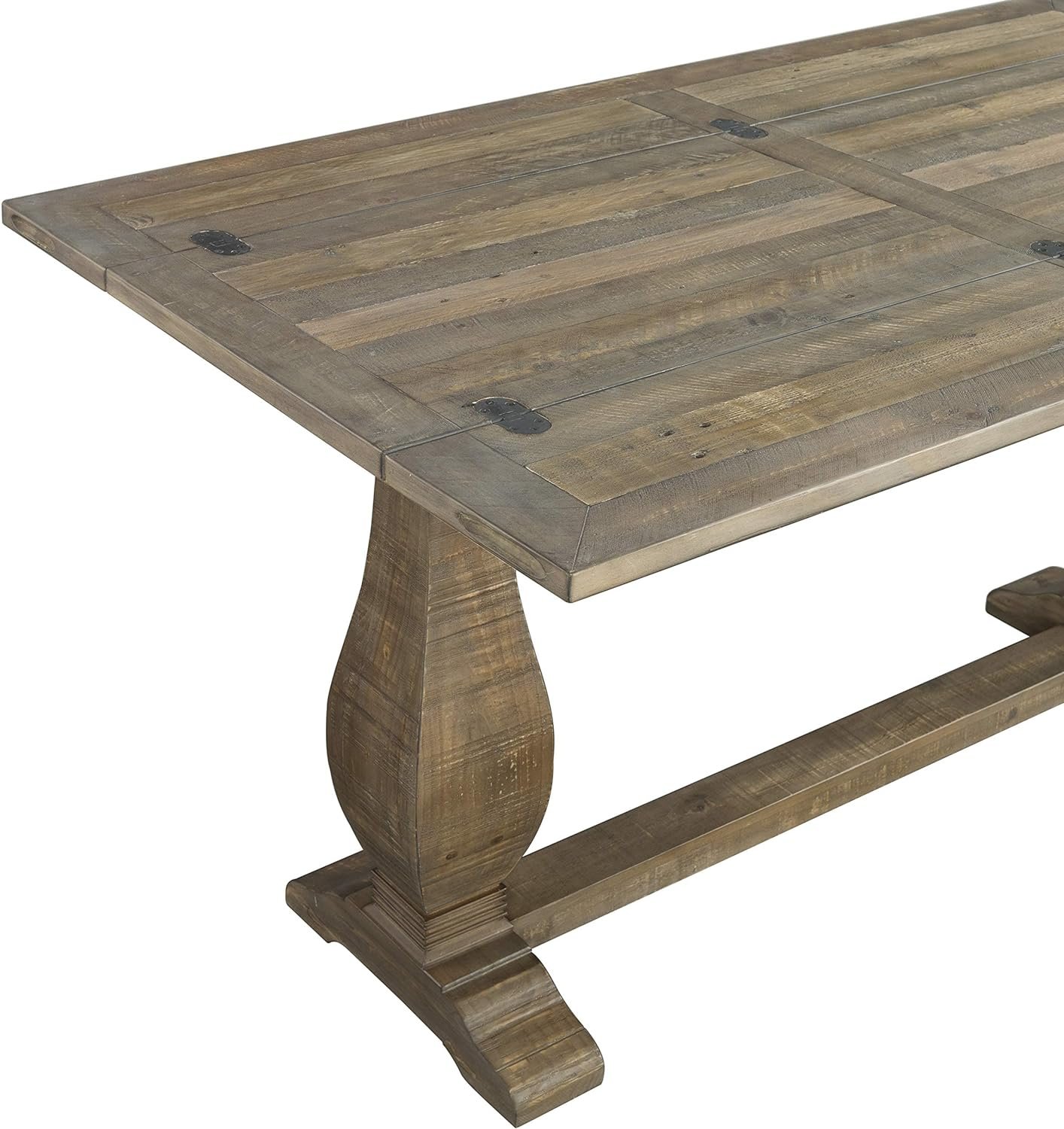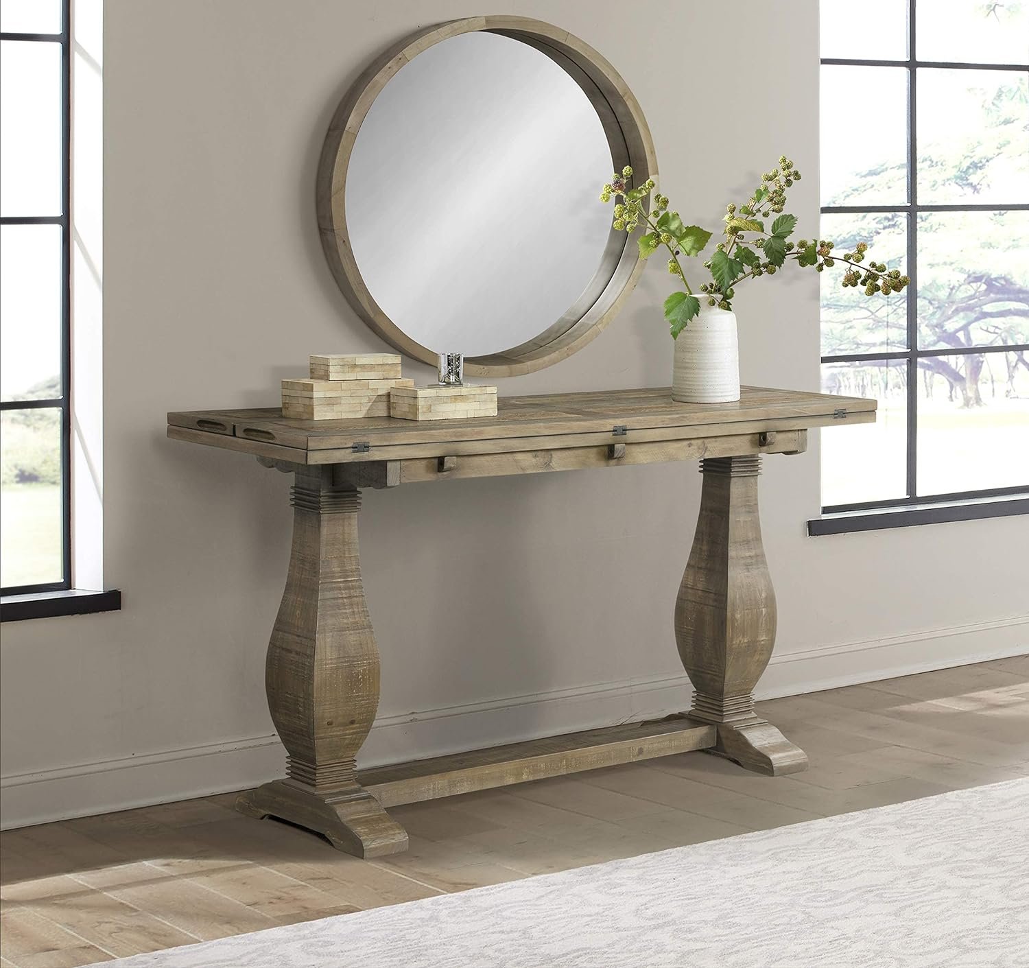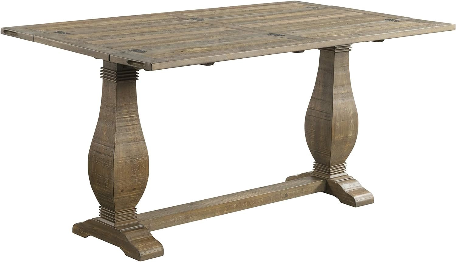 The Napa Flip Top Console Table offers a casual farmhouse style with a pedestal base. This table features a versatile design which allows for the table to be used three different ways: standard sofa table, desk or dining table. Two leaves run length wise on the table and when one leaf is flipped down the table is the perfect size for writing desk. When both leaves are opened, the table turns into a nicely sized dining table. This is the perfect space saving farmhouse style table. The table is constructed of reclaimed or salvaged style New Zealand Pine and finished in a Reclaimed Natural finish. The eye-catching legs feature a classic baluster style leg with additional carved details. The 2” thick tops are detailed with a plank design and natural wormwood and purposeful distress marked details. Assembled product dimensions: 60″ W x 18″ D x 30″ H. Fully opened dimensions: 60″ W x 36″ D x 30″ H. Product materials: New Zealand Pine. Easy to assemble. Made in Vietnam.