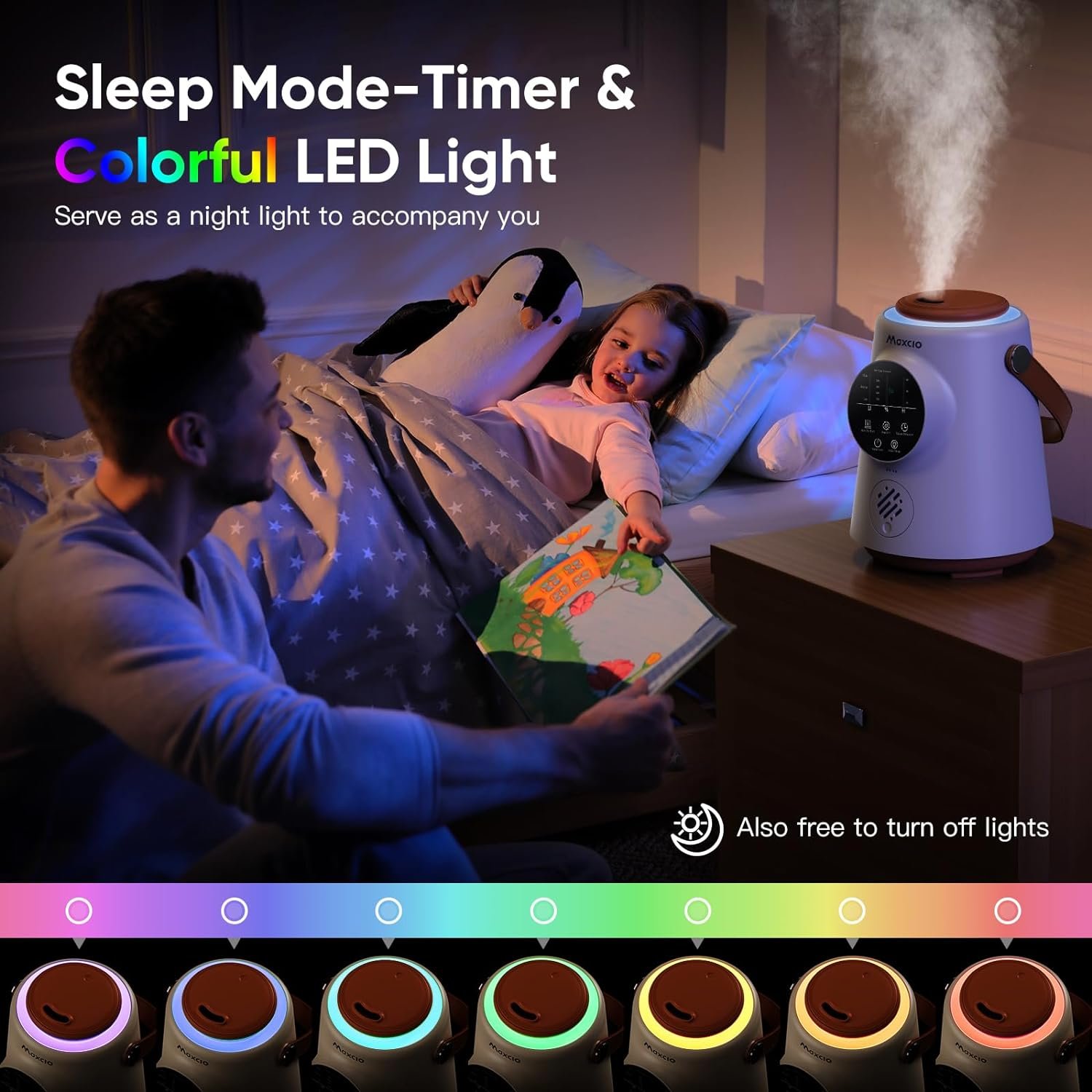 【 Sleep Mode-Auto Shut-off 】The humidifier in sleep mode maintains healthy humidity levels in the room. Night lights in 7 colors provide a romantic atmosphere or you can choose to turn off all lights. The noise level as low as 28dB ensures you sleep peacefully without any disturbance. When the water level is too low or the water tank is removed, the humidifier will automatically shut off.